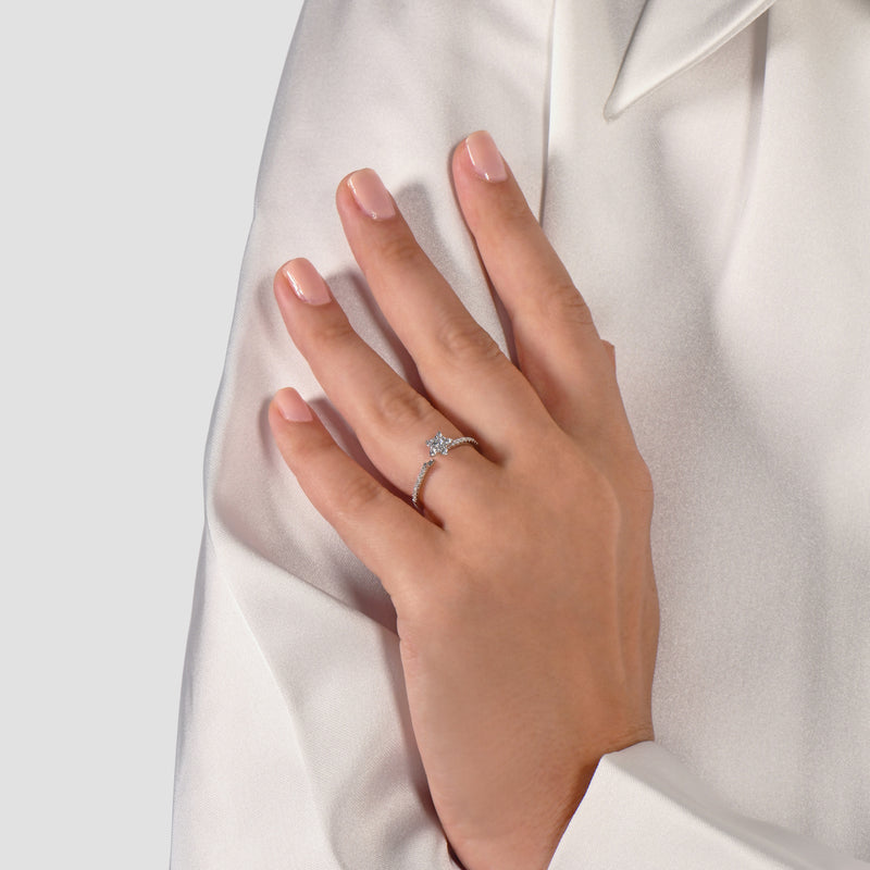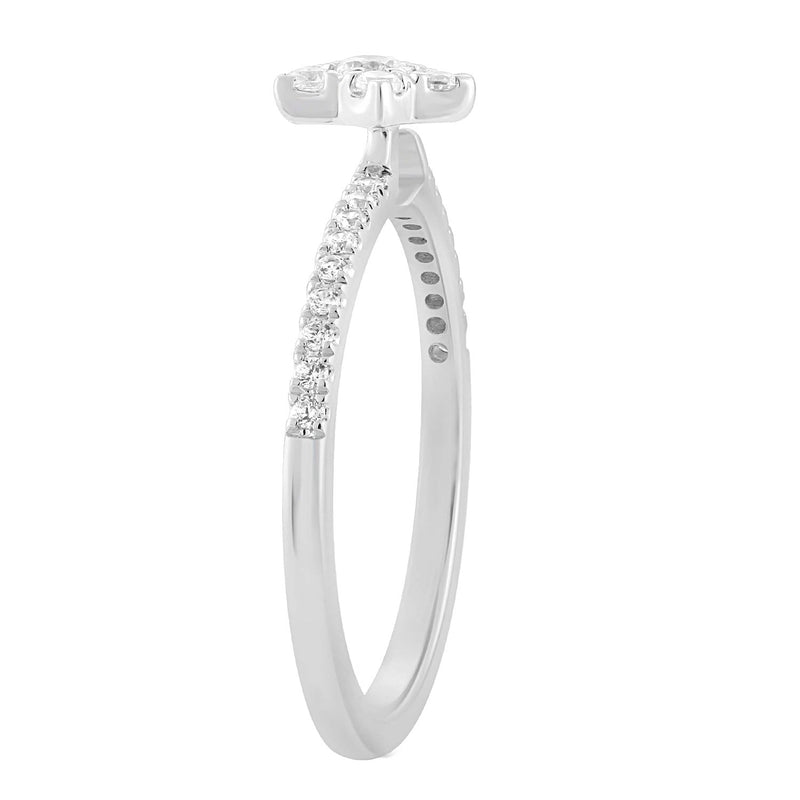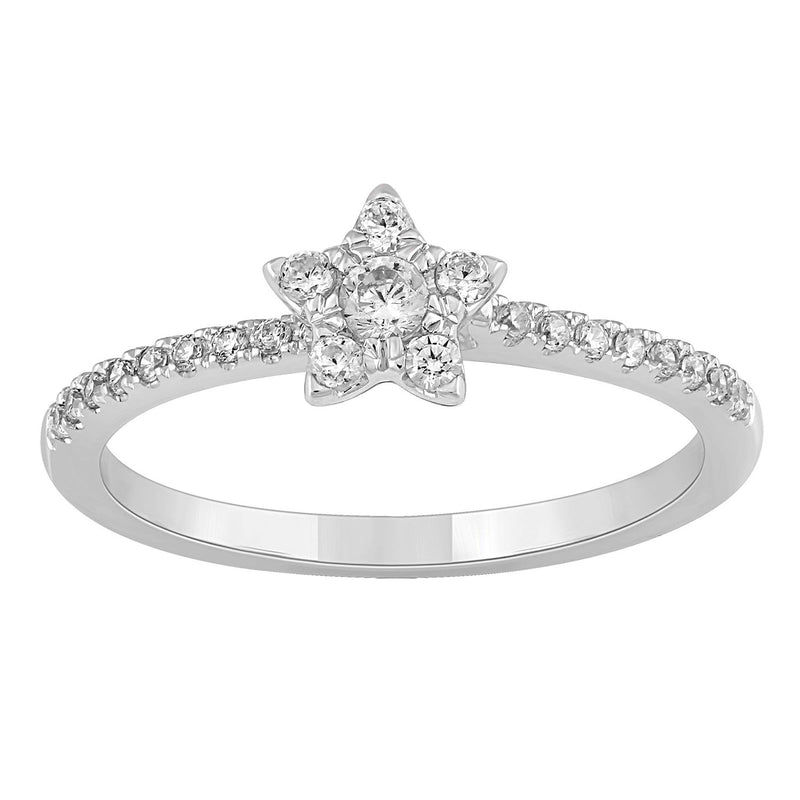 Honor the star in your life with this diamond ring inspired by Tinker Bell. Its slender, diamond-lined shank is crafted in sterling silver and features a star-shaped head that's also covered with brilliant diamonds. Whimsical yet elegant, this Enchanted Disney fine jewelry will surely make your beloved's eyes twinkle as you ask her to marry you and present this engagement ring. Count on this ring's sparkle reflect the glow in your heart and the intensity of your love.