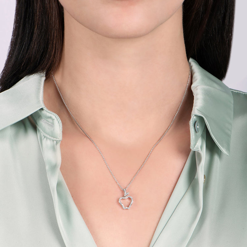 Definitely not the poisonous blood-red apple. This one shines with gentle beauty and glitters with subtle sophistication. Fashioned in 10K white gold and sculpted to form an apple's outline, this Snow White-inspired necklace shimmers with 1/8 CTTW of round diamonds. Even the tiny leaf detail is encrusted with sparkling diamonds. This is indeed one good apple that you need not think twice about welcoming into your collection.