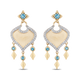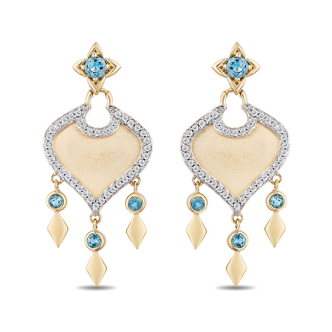 Glam up any outfit with this pair of statement earrings inspired by Princess Jasmine's sense of style. A creation from the Enchanted Disney Fine Jewelry Collection, these earrings feature a 10K gold arabesque silhouette beautifully outlined with sparkling 1/10 cttw diamonds. Hanging on it is a trio of kite-like dangles topped with bezel-set blue topaz. Meticulously crafted by skilled artisans, this fanciful pair of earrings can definitely elevate any look.