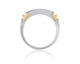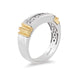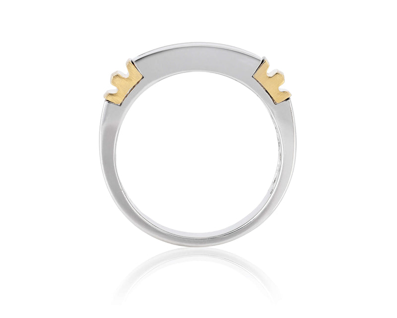 Exchange "I dos" in style with an Enchanted Disney Collection Wedding Band. This ring is perfect for your groom who wants his bling unique and modern yet elegant. A Prince-inspired ring, this fine jewelry features a 14 carat two-toned gold band. It is decorated with a row of five diamonds along the white gold shank and flanked by inset yellow gold ridged crowns in satin finish.