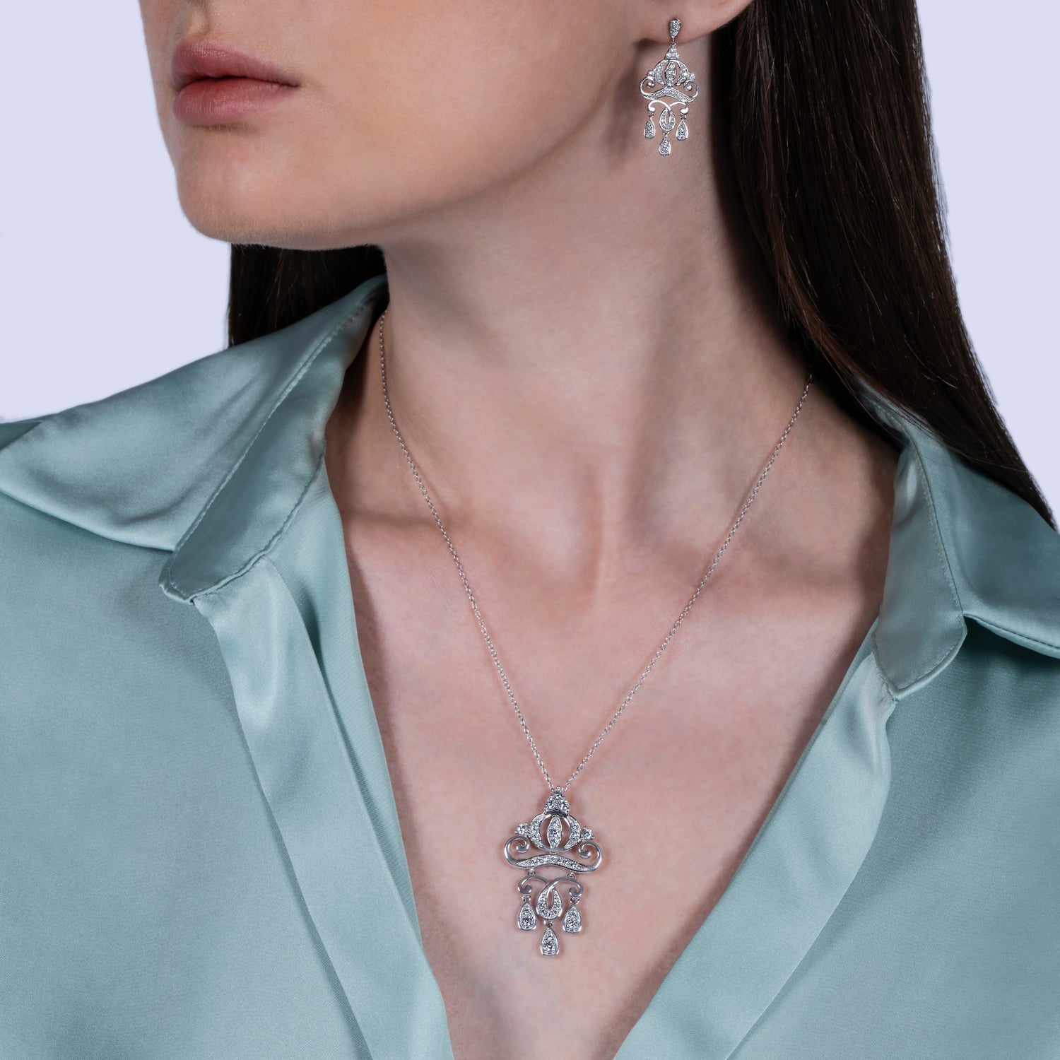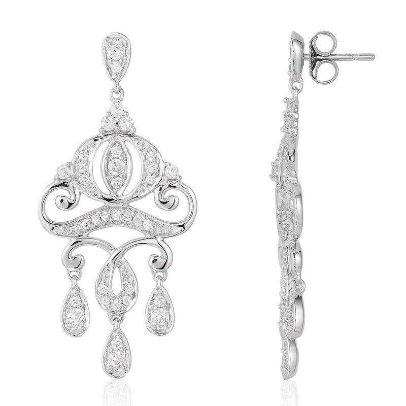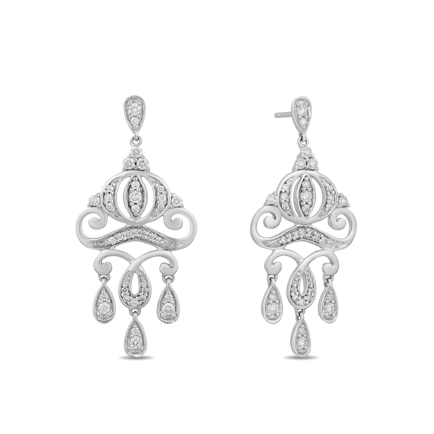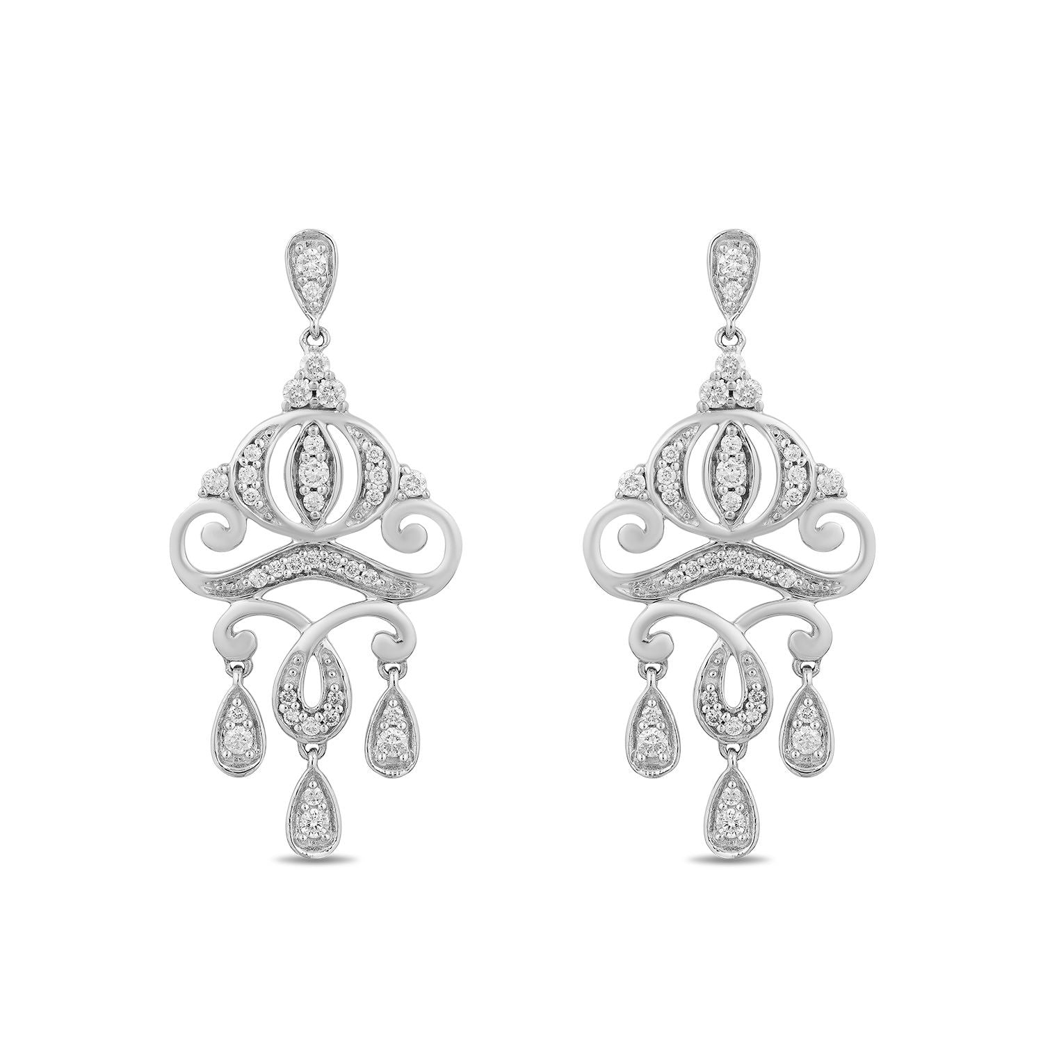 Give your dressy outfits a magical sparkle by pairing it with this Enchanted Disney Cinderella Carriage Chandelier Earrings. These are creatively designed to feature 1/2 carat total weight of diamonds on an intricate 14K white gold carriage with three diamond-studded teardrop dangles. Comfortable to wear, the posts are secured with friction backs. You'd be surprised how these gorgeous earrings can transform your ensemble and allow you to make a truly dramatic entrance.