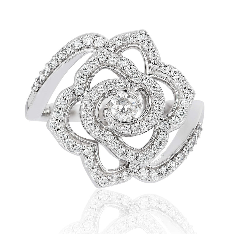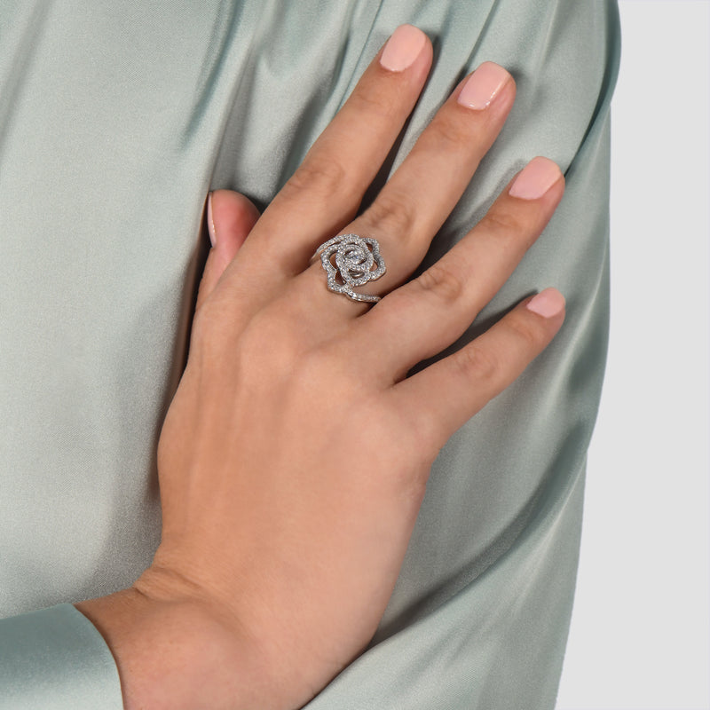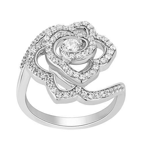 You can't deny the attention-grabbing appeal of this flower cut-out ring. Small, round 5/8 cttw diamonds traverse a sterling silver flower cut-out shank and lead the eye toward the dazzling 1/8 ct center stone. This alluring Enchanted Disney Rose jewelry is inspired by Belle and showcases a sparkly, modern beauty that resonates with confident women who know what they want and how to get it.