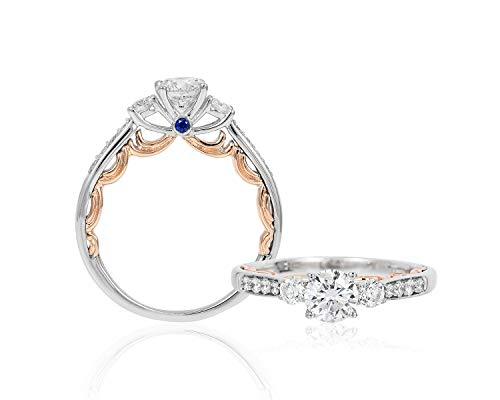Here is a diamond ring that perfectly exudes Cinderella's guileless spirit. An Enchanted Disney Fine Jewelry ring, this 14K white gold and rose gold band showcases a vintage design with three-stone centerpiece. Meant as an engagement ring to symbolically represent those three magic words, this ring has three round cut diamonds in prong setting on its center emphasized by diamond side stones in pave setting. Just right under the centerpiece is a blue sapphire for that extra mystical charm.
