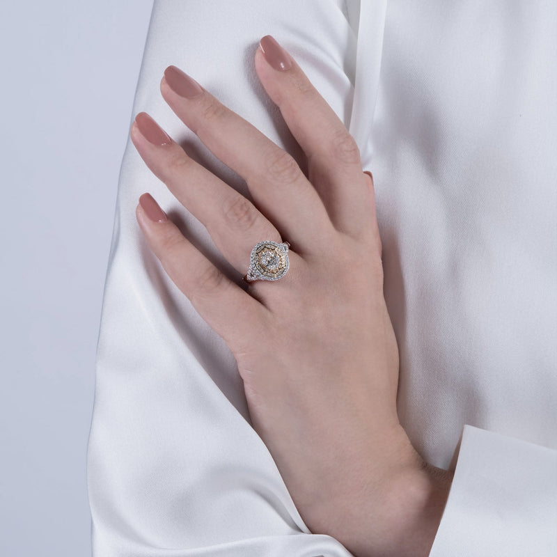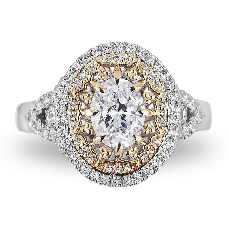 This two-toned diamond ring inspired by Princess Jasmine is a magnificent jewel to symbolize your love and devotion. It features a 1-carat oval-cut center diamond in a distinct eight-prong setting with an arabesque frame in yellow gold. Surrounding this ornate frame is a circular border of diamonds plus even more diamonds on the white gold split shank. Indeed, this is The Ring that can brilliantly reflect the radiant love you have for her.