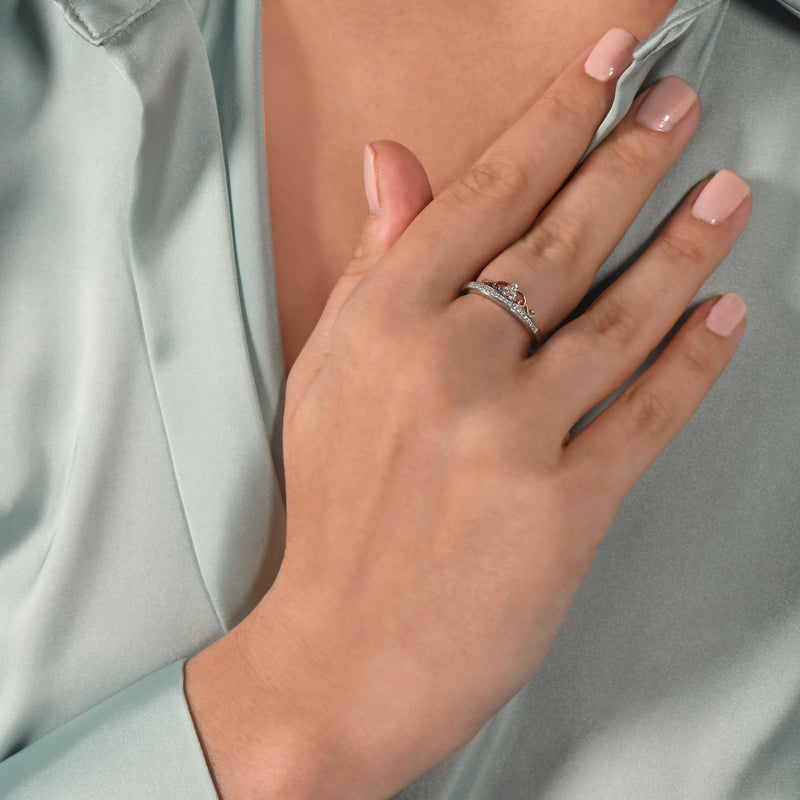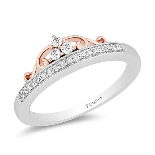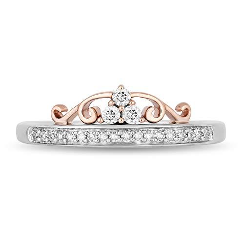 The feminine and ladylike look of this ring will surely dazzle your princess. A bewitching piece of fine jewelry from the Enchanted Disney Fine Jewelry collection, here is a Tiara Ring fashioned in 10K White and Rose Gold With 1/6 Cttw Diamond. Inspired by a majestic princess, this ring's regal beauty is sure to complement that of your significant other.