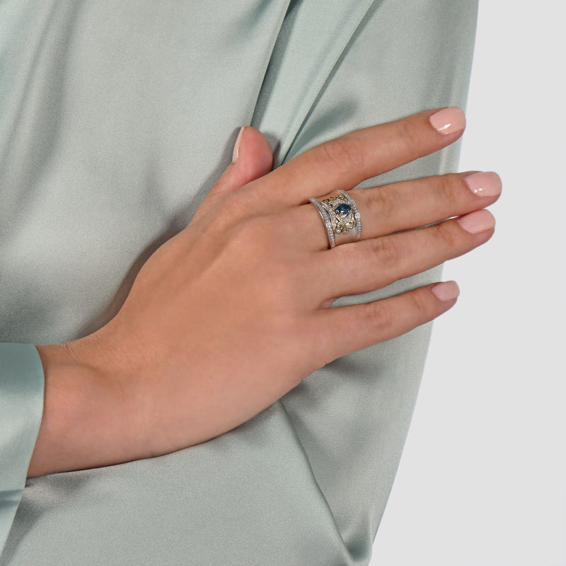 Simple but statement-worthy, this chunky ring inspired by Cinderella makes you break fashion rules yet still remain oh-so-chic. Designed with a thick band in 14k white gold, this ring showcases a carriage centerpiece in yellow gold adorned by an oval-shaped London Blue Topaz. This two-toned ring and its textural quality will take any outfit to the next level. Get this for yourself or someone you love and jazz up your accessory game.
