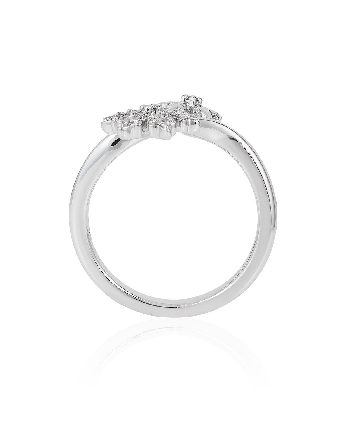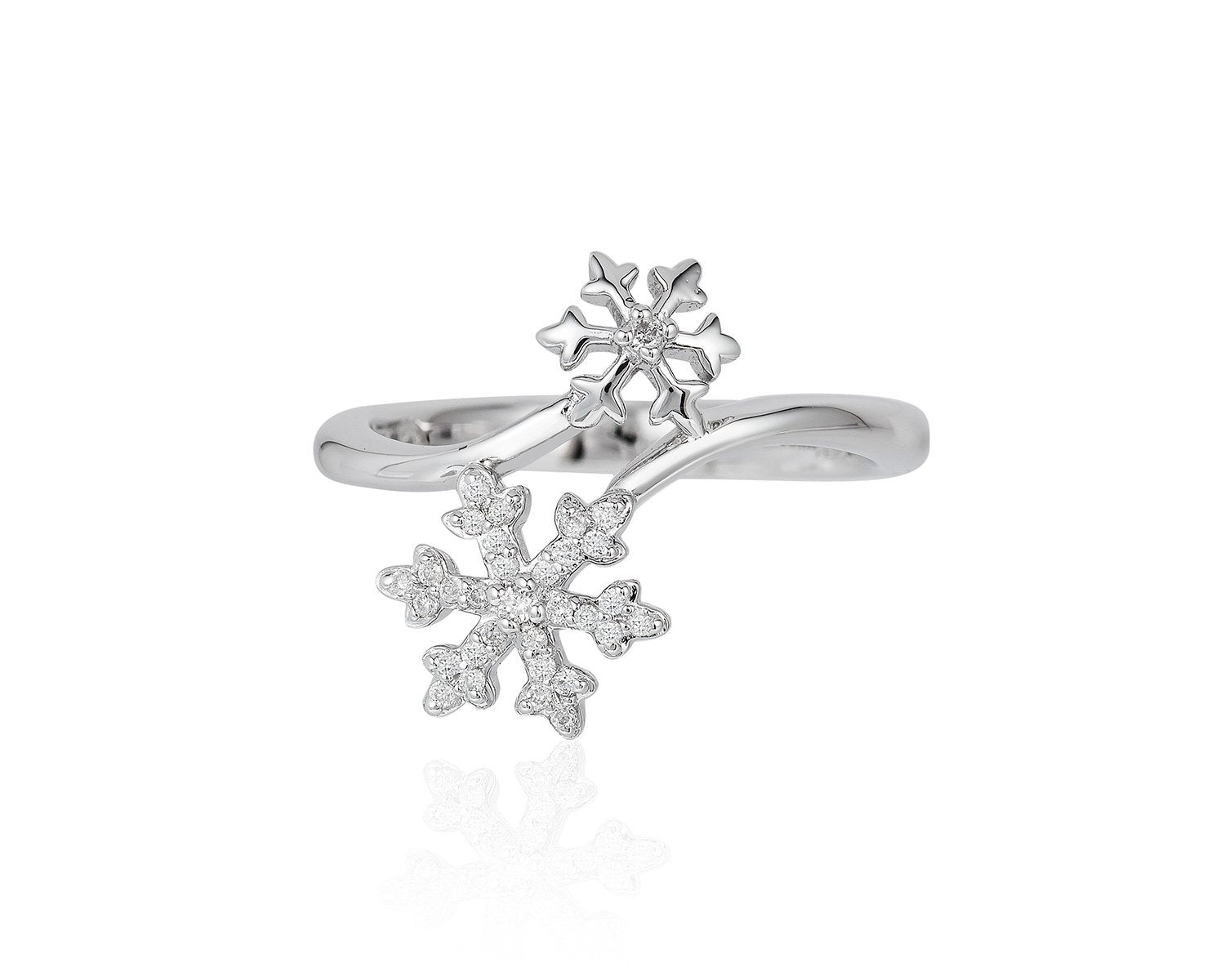 Enchant the love of your life with this intricately cut snowflake ring. Inspired by Elsa, here is a sparkling fashion accessory that will delight anyone who sees it. Its bypass shank is crafted in polished sterling silver while the elaborate snowflake cutouts are dotted with 1/10 cttw radiant diamonds. Your lucky lady will surely feel, show and won't conceal her love for you when she receives this majestic snowflake ring.