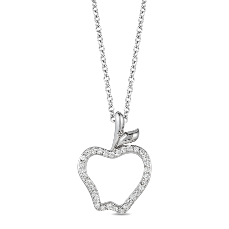 While we cannot guarantee that this apple will bring your Prince Charming closer to you, we are certain that this one has no poison or curse. Designed to bring you just the good things, here is a good apple from the Enchanted Disney Fine Jewelry Collection. It is expertly crafted in durable sterling silver and lined with 1/10 cttw diamonds. Inspired by Snow White, this glistening apple necklace is sweet, perfect, and handpicked just for you.