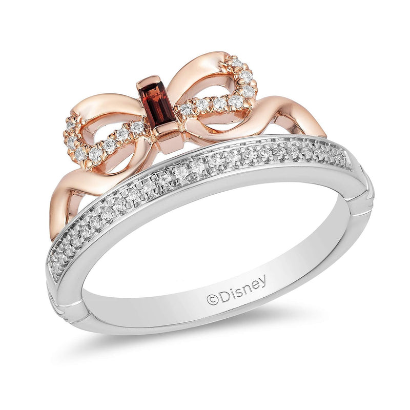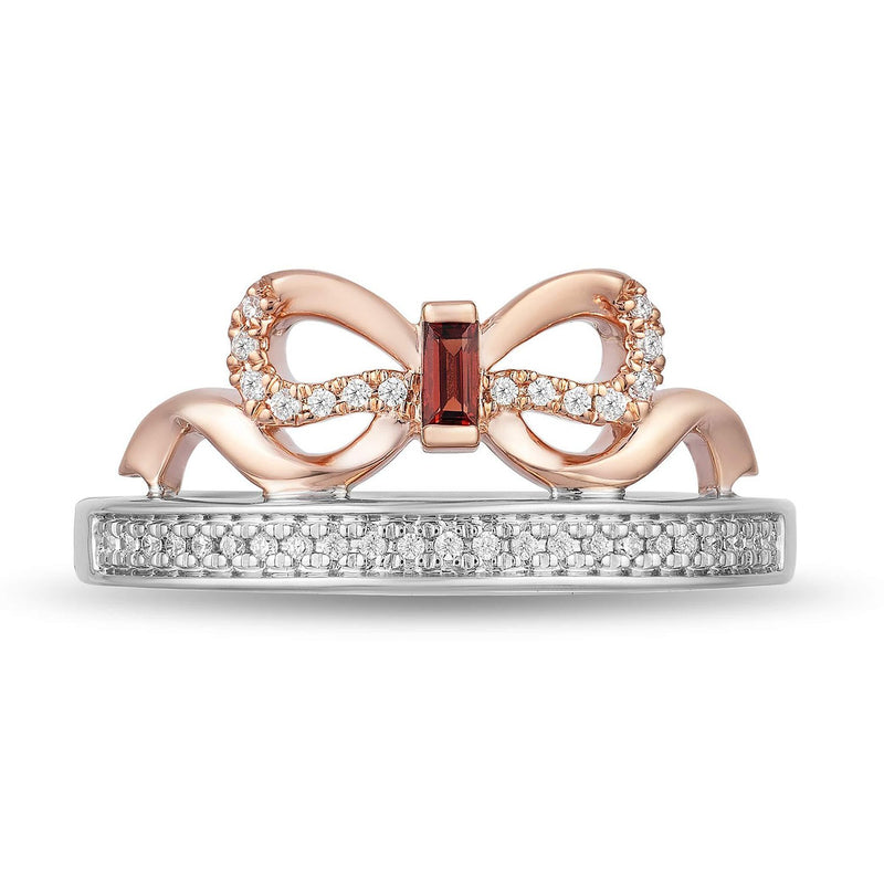 Enchanted Disney Fine Jewelry Sterling Silver and 10K Rose Gold 1/10CTTW Diamond and Garnet Snow White Bow Fashion Ring