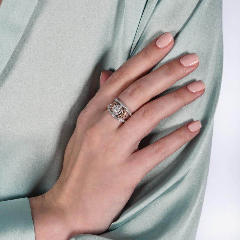 Why wait for a prince to spoil you when you can just treat yourself to something you so deserve? Go get this diamond ring for yourself and show them men that you're completely capable of providing for yourself. This sterling silver open split band has its borders lined with diamonds. At the center is a cluster of pave diamonds enclosed in a diamond-studded halo that's emphasized by 10k rose gold filigree. This Princess Crown Ring from the Enchanted Disney Collection perfectly suits the princess inside you.