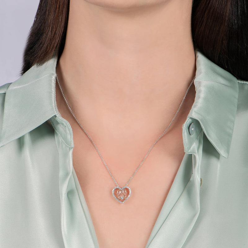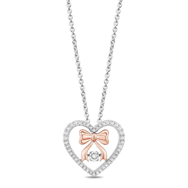 Got a Snow White in your life? She's affectionate, gentle, quick to charm, and sweet. Her inherent kindness is admirable and her optimism is infectious. Treat her to this beautiful Sterling Silver and 10K Rose Gold Necklace with 1/5 CTTW Diamond. From the Enchanted Disney Fine Jewelry and inspired by Snow White, this heart pendant with a bow accent is a thoughtful gift she'll treasure for a lifetime.