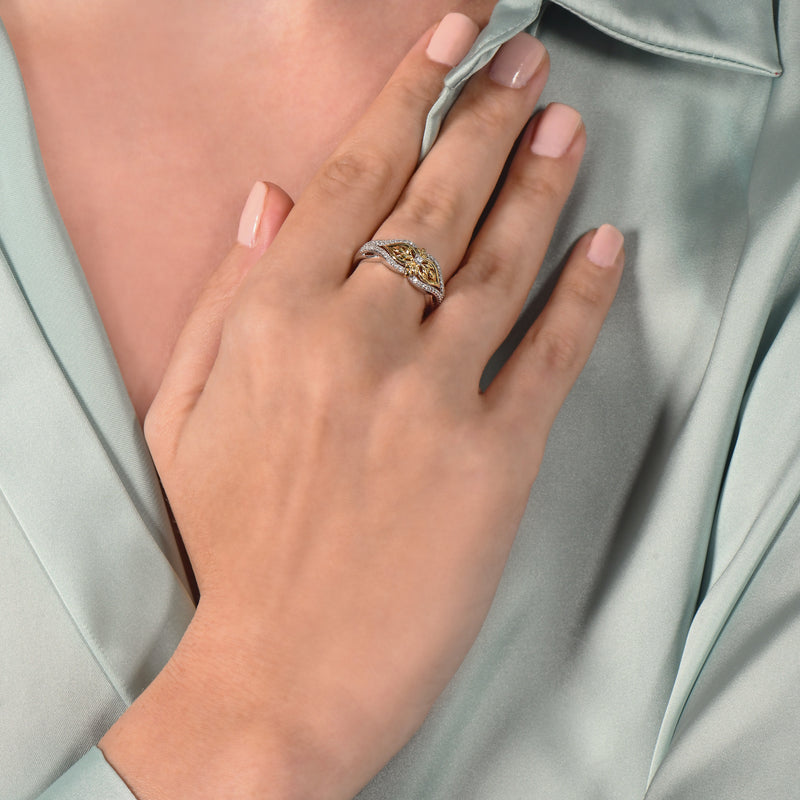 Some things never change, that's true. So, convey the love that you feel for her, once again, through this Enchanted Disney Fine Jewelry Sterling Silver and 10K Yellow Gold with 1/5 CTTW Diamonds Anna Ring. Exuding Anna's free-spirited vibe, this ring can articulate your love and admiration for your beloved's playful and optimistic nature - the personality traits that actually made you fall in love with her.