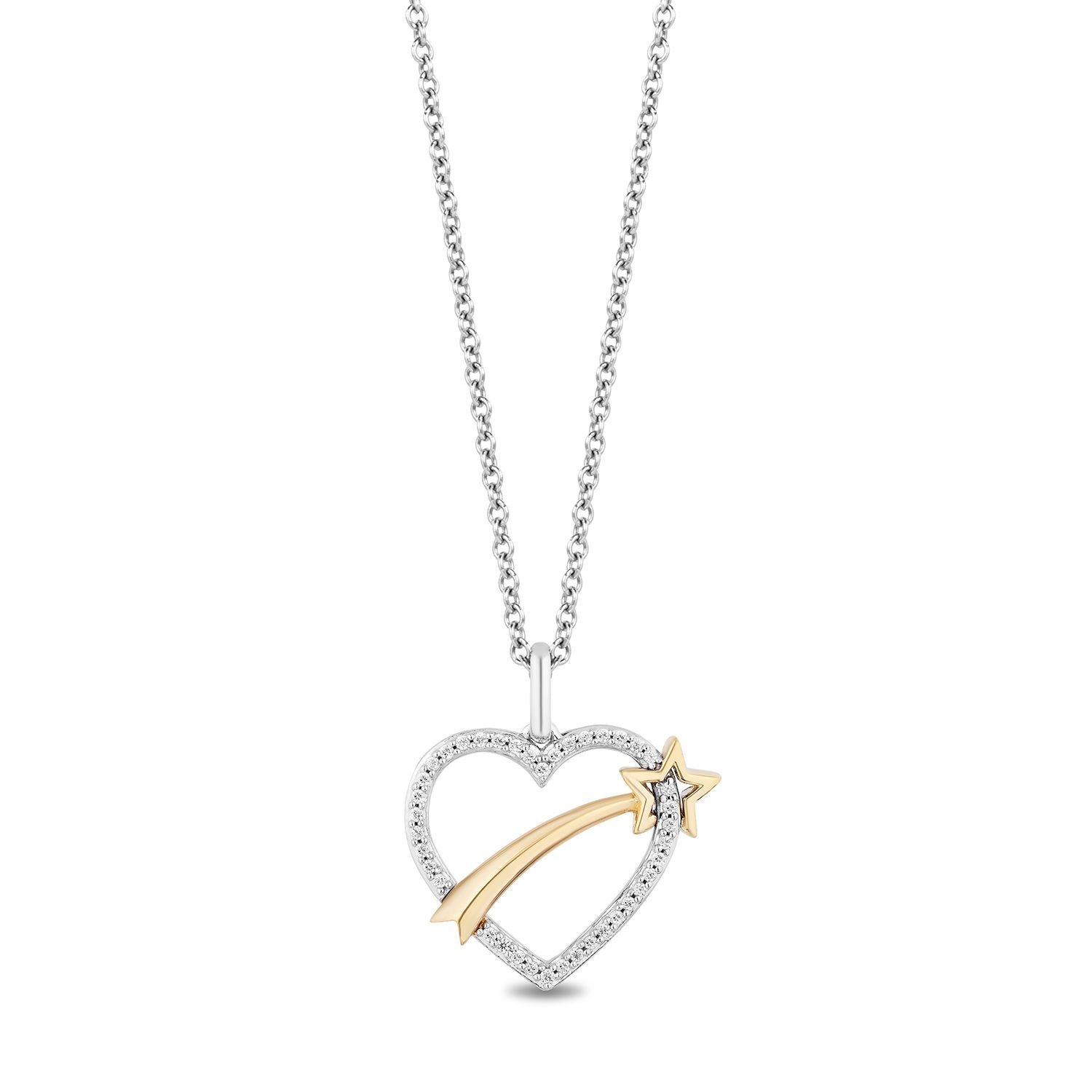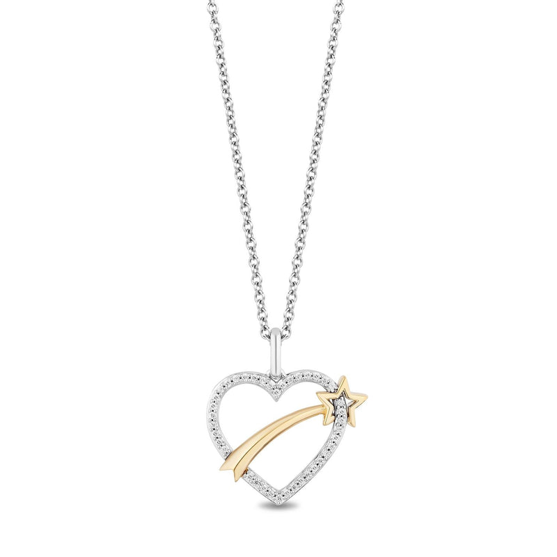 Give yourself more than a pat on the back with this Enchanted Disney Fine Jewelry Sterling Silver and 10K Yellow Gold 1/6 CTTW Natural White Round Diamond Tinker Bell Pendant Necklace. A lovely treat from you for you to celebrate an accomplishment or a milestone, this heart-shaped pendant with a shooting star accent will make a great reminder of your hard work to achieve your goals and your determination to reach for the stars.