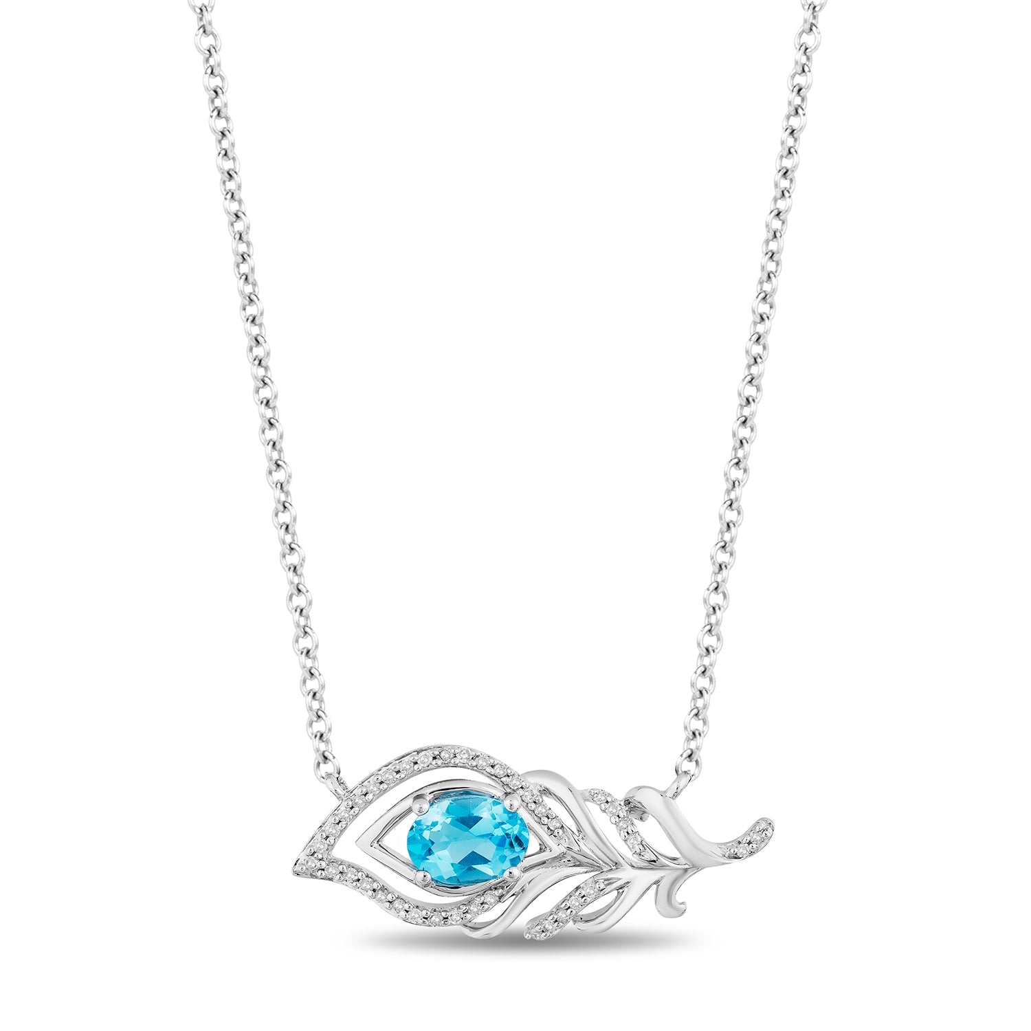 A lovely pendant shaped like the feather of a majestic bird. This Enchanted Disney Fine Jewelry Sterling Silver with 1/10 CTTW Natural White Diamond and Swiss Blue Topaz Jasmine Pendant Necklace displays a peacock pendant in simple yet classy sterling silver. It sparkles with just the right amount of glitter and it shines with just a hint of color. This is a necklace perfect for someone who shines without even trying.