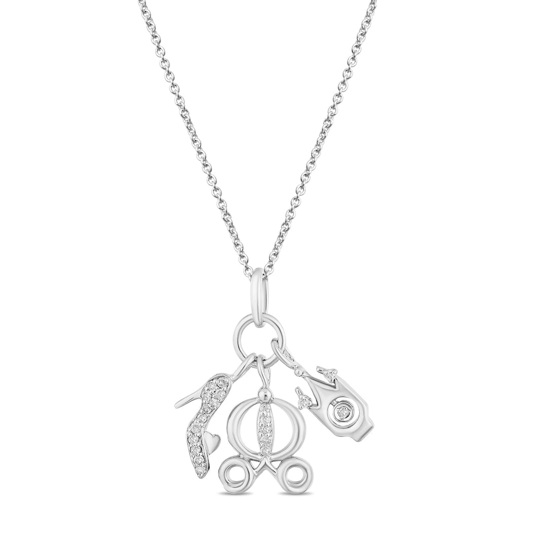 You don't have to be a princess to change the world. Take it from Cinderella and let this This Enchanted Disney Fine Jewelry Sterling Silver with 1/10 CTTW Diamond Cinderella Pendant Necklace remind you of three important things. The glass slipper, the carriage, and the clock from Cinderella's tale tell you to not let hardships break you, never forget where you came from, and make the most of your time.