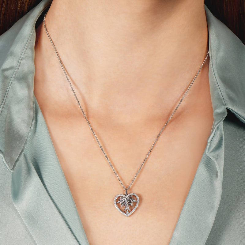 The Enchanted Disney Fine Jewelry Sterling Silver 1/5 CTTW Natural White Round Diamond Elsa Pendant Necklace features an open silhouette of a sparkling heart pendant adorned at the center with a twinkling form of sharp ice crystals. Great as a gift for someone you love or as a treat for yourself, this piece of jewelry makes for a vivid reminder of selfless giving and sacrifice in love.