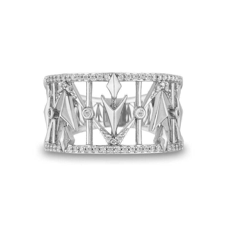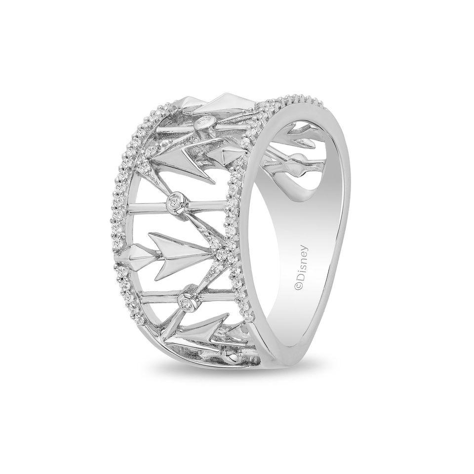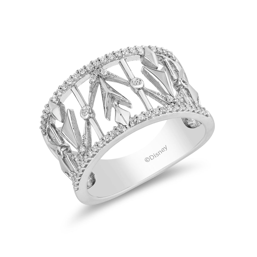 Let this Enchanted Disney Fine Jewelry Sterling Silver Elsa Ring inspire you to walk through your fears and harness your inner strength. Designed with an open cut-out wide band with sculpted snow crystals, this ring with 1/6 cttw of natural round white diamonds radiates Elsa's strong will, confidence, and courage. Take inspiration from her character through this ring and be the empowered queen that you are.