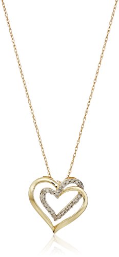 Jewelili 10K Yellow Gold with 1/4 CTTW Diamonds Double Heart Pendant Necklace