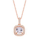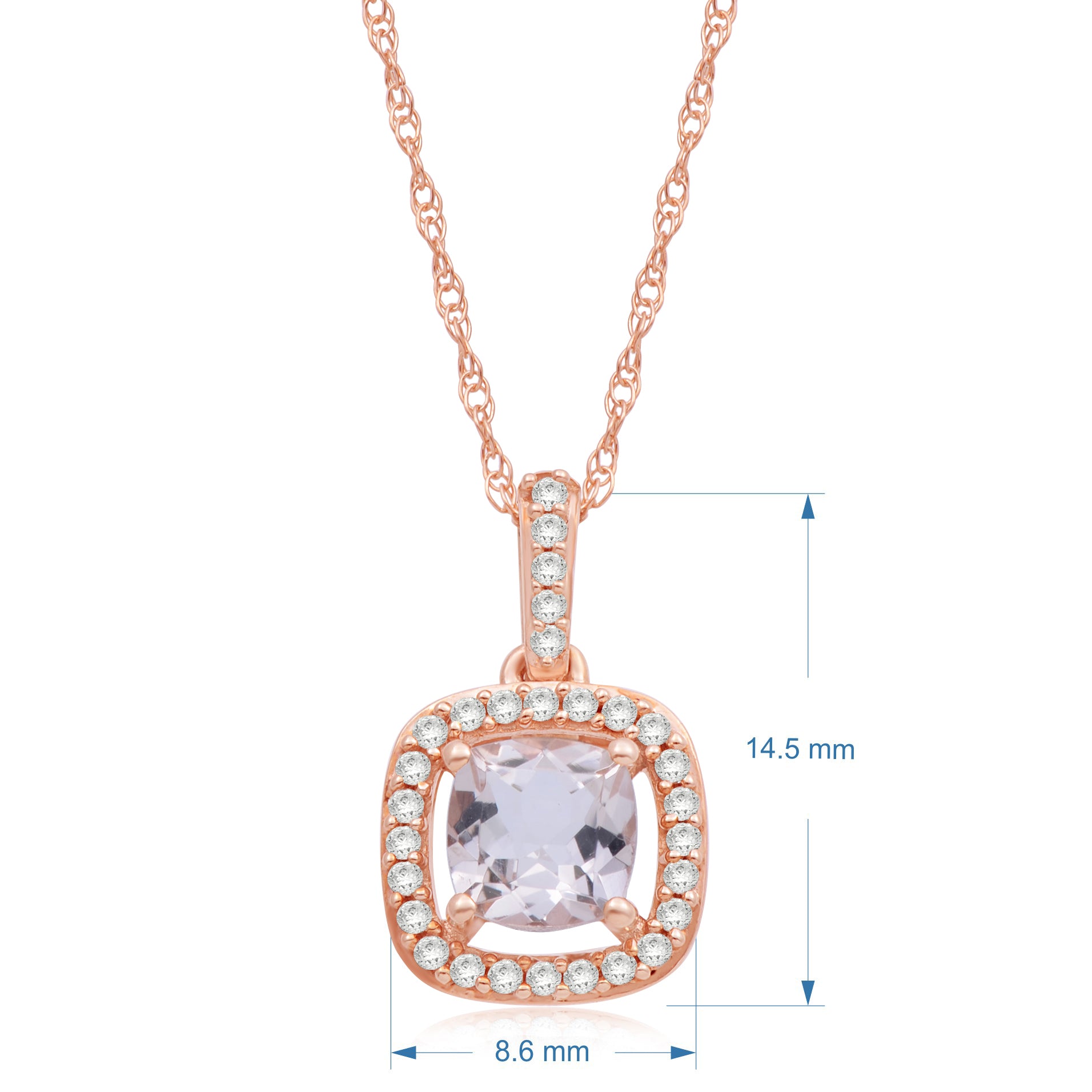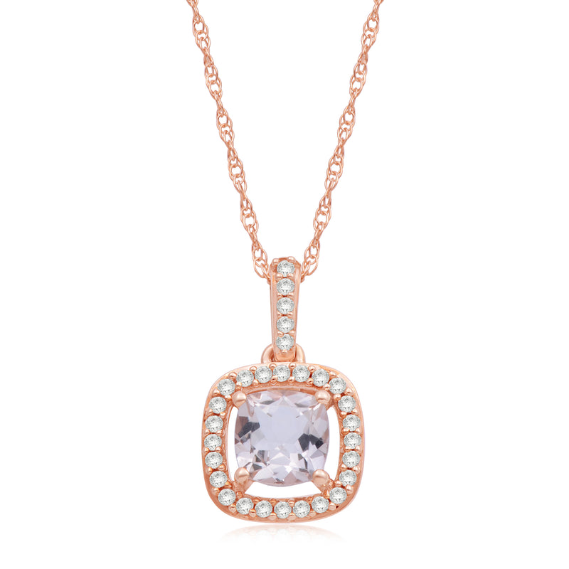 Details: 10K Rose Gold 5 MM Cushion Cut Morganite and 1/10 Cttw Natural White Round Diamond Halo Pendant Necklace