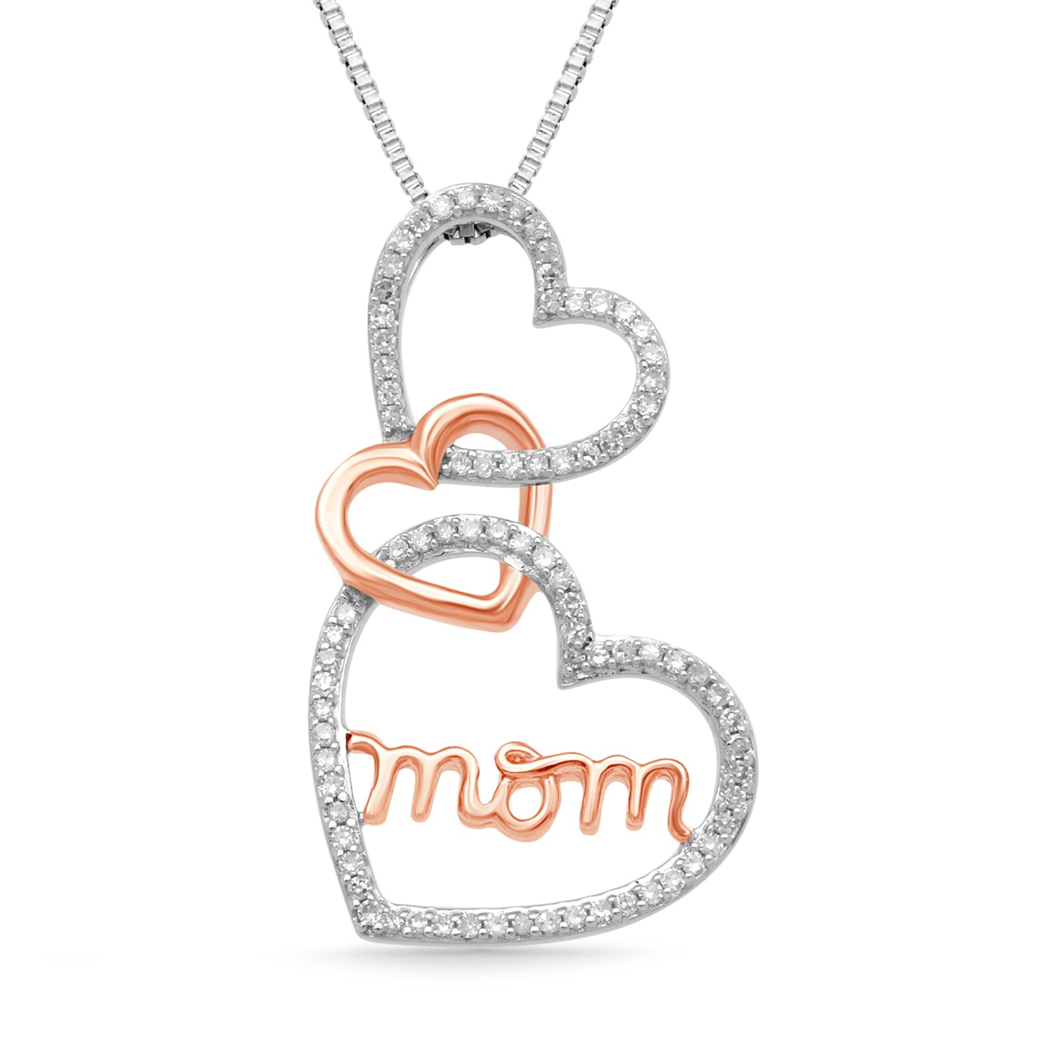 • Sterling Silver and 10K Rose Gold With 1/4 CTTW Natural White Round Diamonds Triple Heart Mom Pendant Necklace