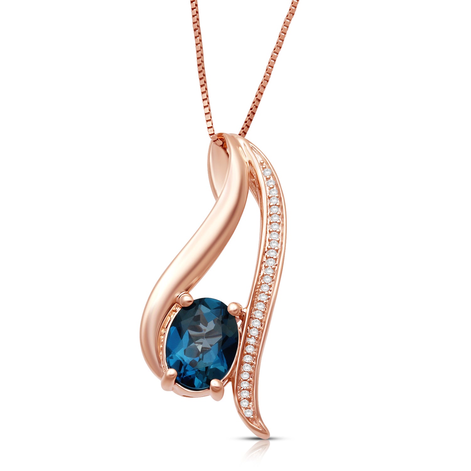 Details: 10K Rose Gold Swirl Pendant with 8 X 6MM Oval Blue Topaz and White Diamond Accent, 18"