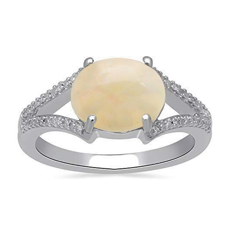 • Sterling Silver With Oval Shape Ethiopian Opal and Natural White Round Diamond Accents Ring