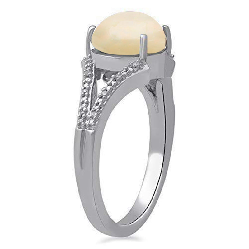 Jewelili Sterling Silver With Oval Shape Ethiopian Opal and Natural White Round Diamonds Ring