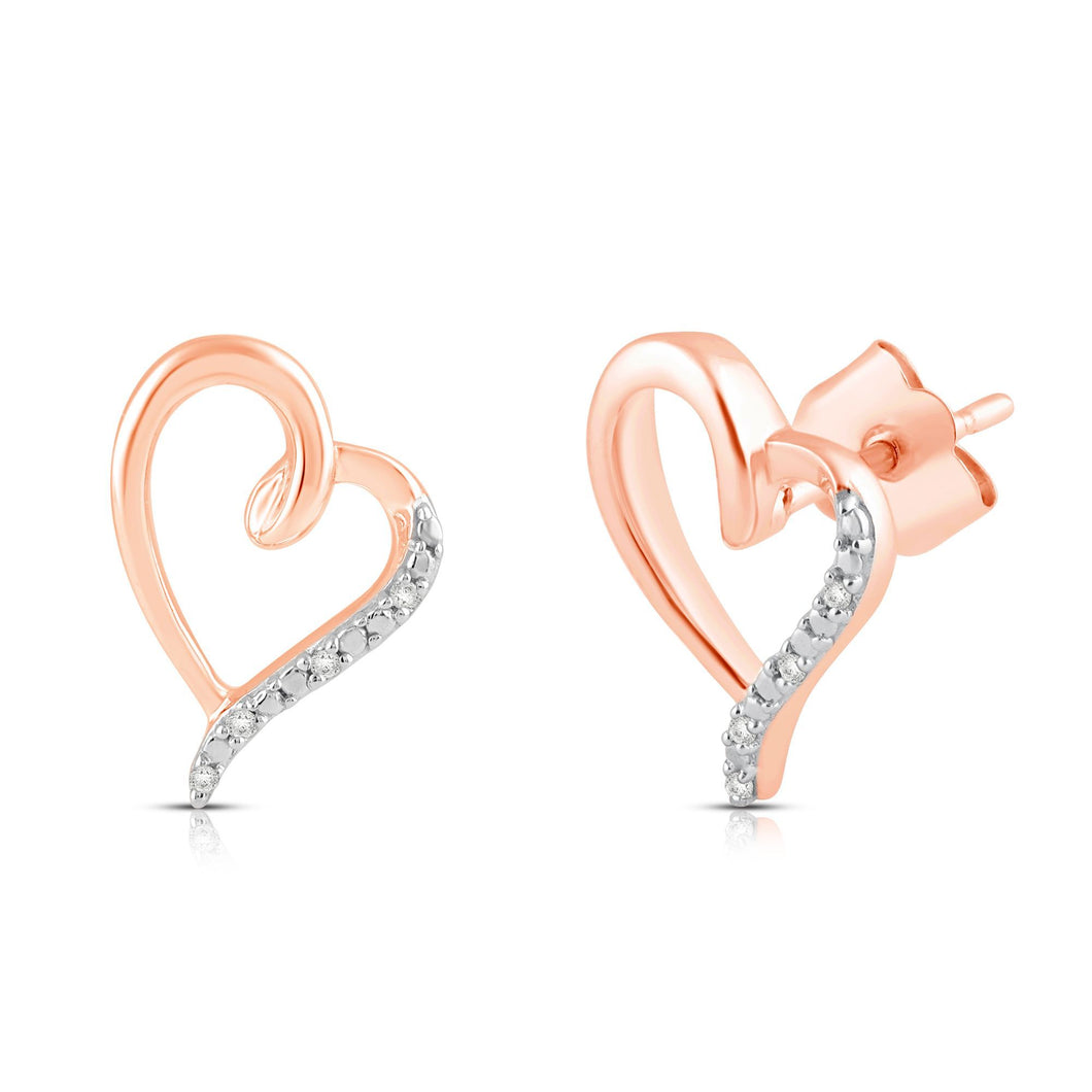 Jewelili 10K Rose Gold With Diamonds Heart Stud Earrings