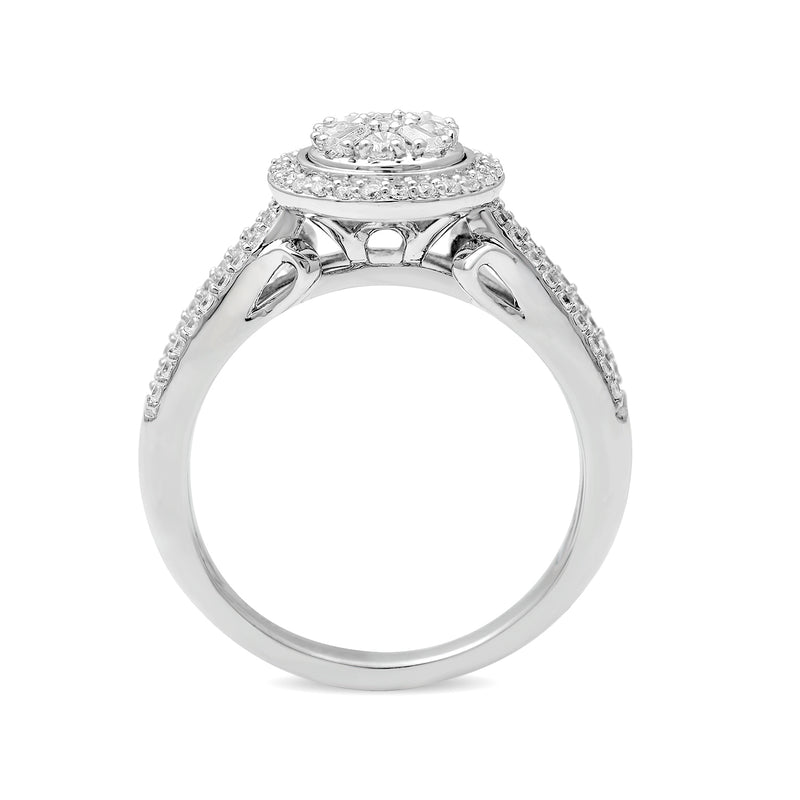 Details: 10K White Gold 1/2cttw Baguette and Round Natural White Diamond Engagement Ring