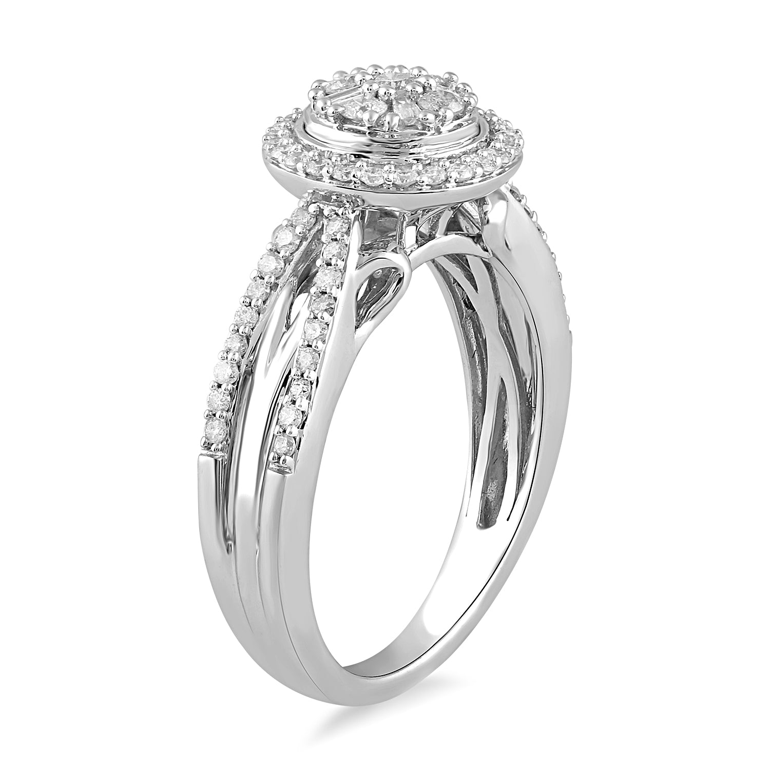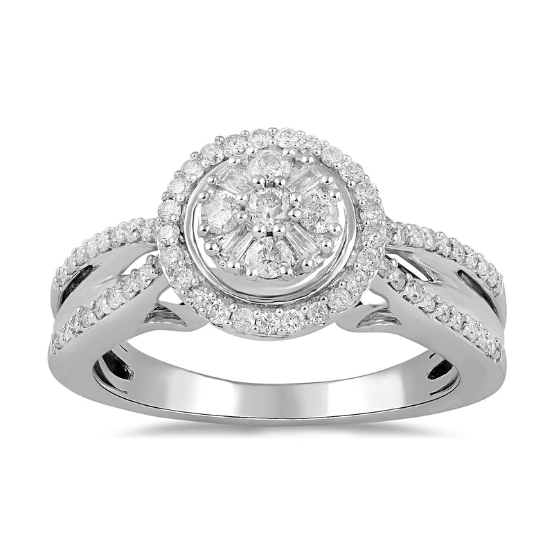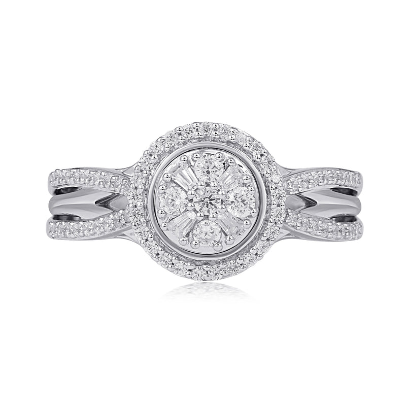 Jewelili 10K White Gold 1/2 CTTW Baguette and Round Natural White Diamonds Engagement Ring