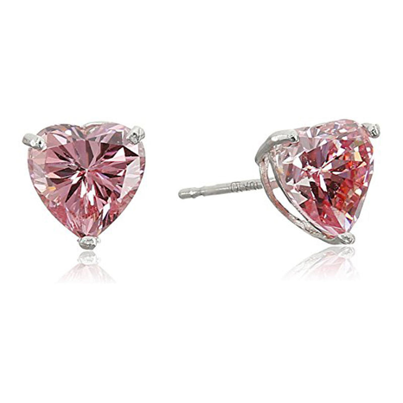 Jewelili 10K White Gold Heart Pink Cubic Zirconia Stud Earrings