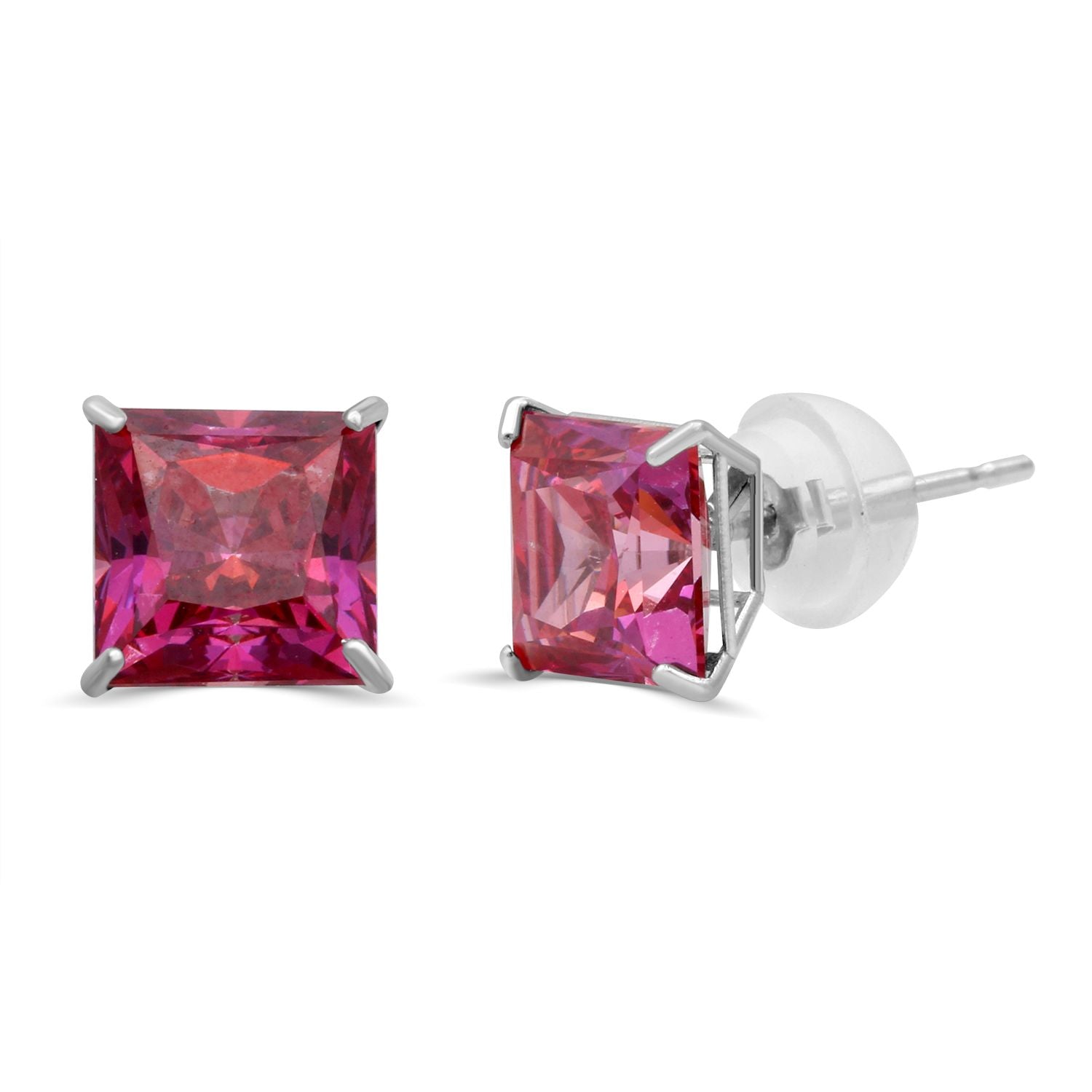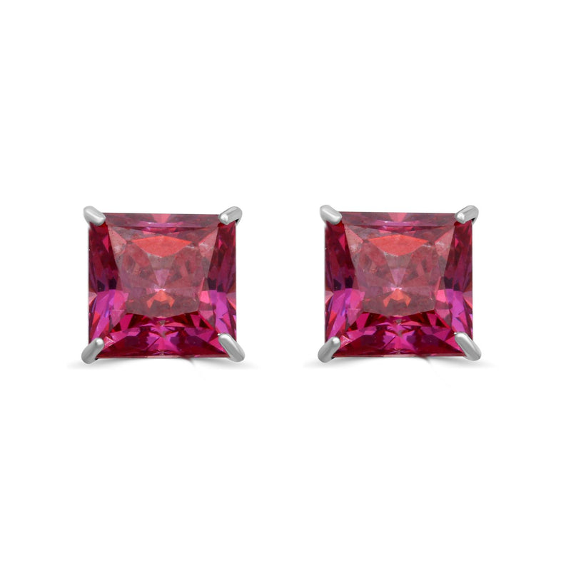 Jewelili 10K White Gold Ruby Cubic Zirconia Square Shape Stud Earrings