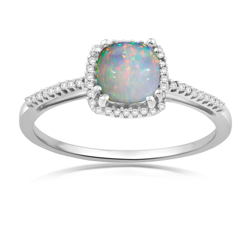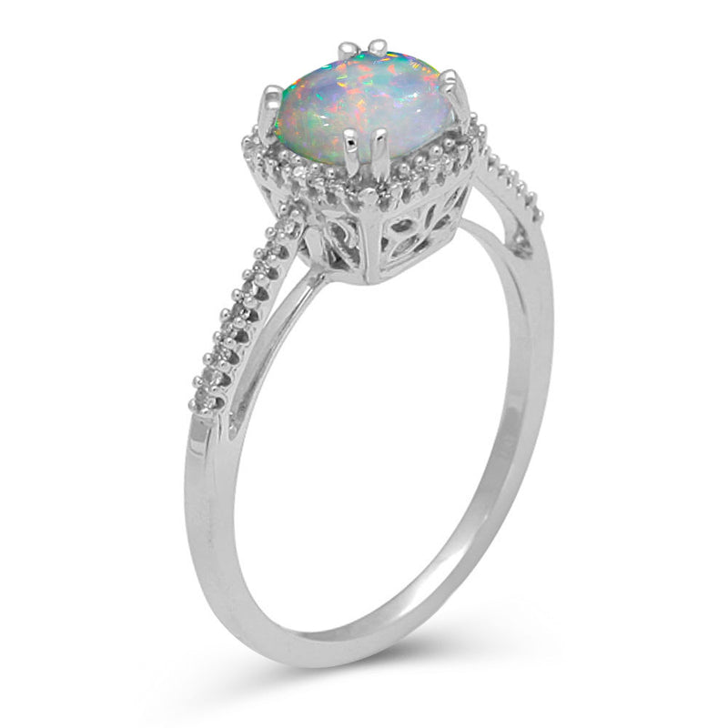• Jewelili 10K White Gold With 1/10 Cttw White Diamonds and Cushion Shape Created Opal Ring