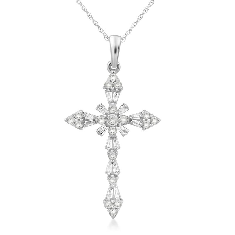 • 10K White Gold with 1/2 Cttw Natural White Round and Baguette Diamonds Cross Pendant Necklace