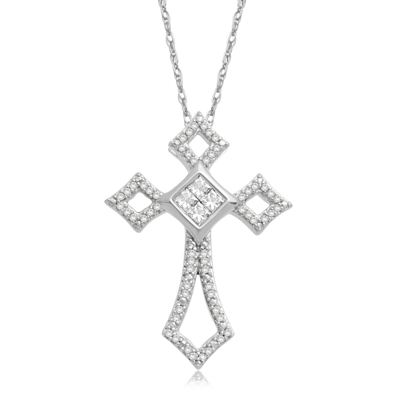 • Invisible Waxset Princess Cut and Prong Set Round Natural White Diamond 10kt White Gold Cross Pendant Necklace.
