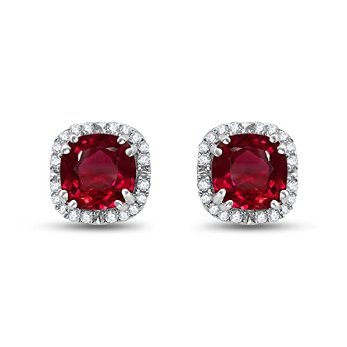 Jewelili 10K White Gold with Cushion Cut Created Ruby and 1/10 CTTW Round Natural White Diamonds Halo Stud Earrings