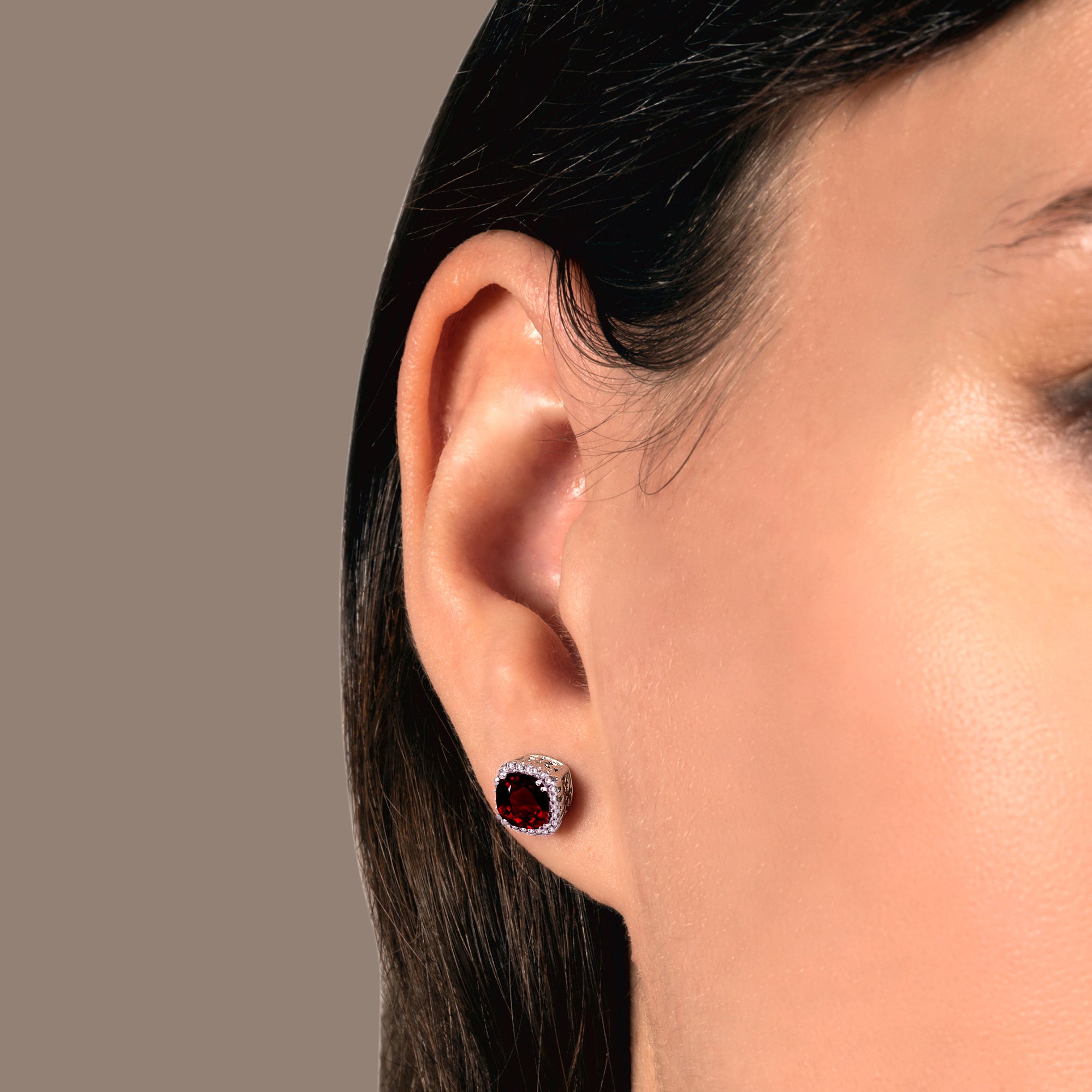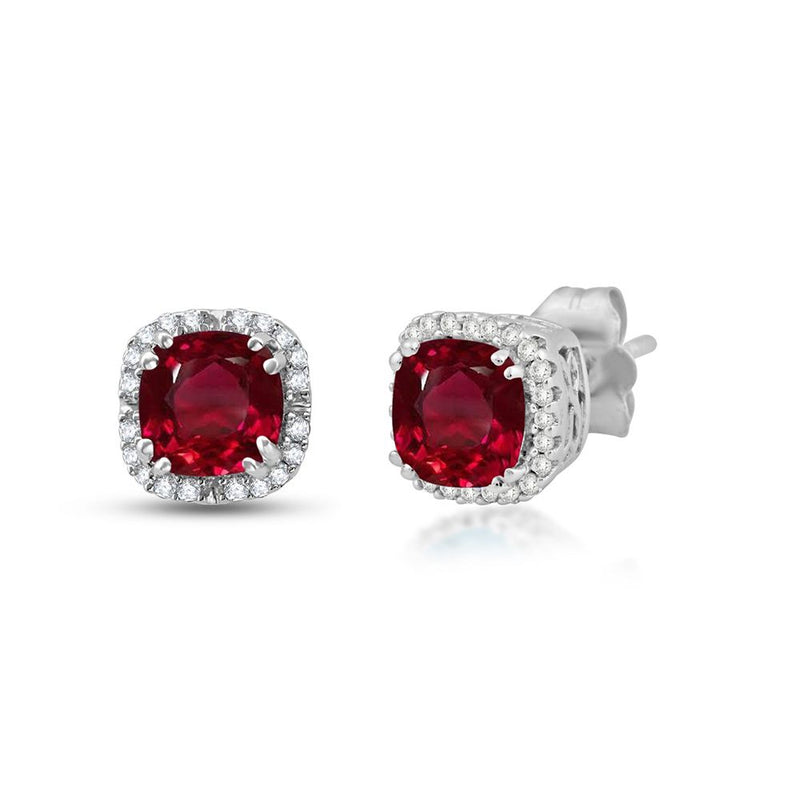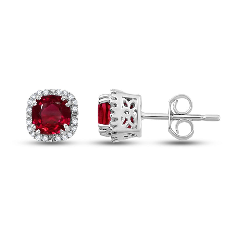 Details: 10K WHITE GOLD BIRTHSTONE CREATED RUBY EARRING WITH GENUINE WHITE DIAMONDS (0.10 cttw, I-J Color, I2 Clarity)