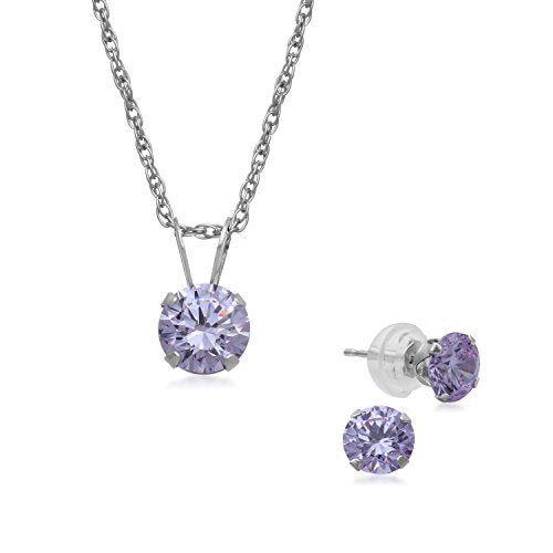 Details: 10K White Gold With Lavender Cubic Zirconia Stud Earrings and Pendant Necklace Jewelry Set