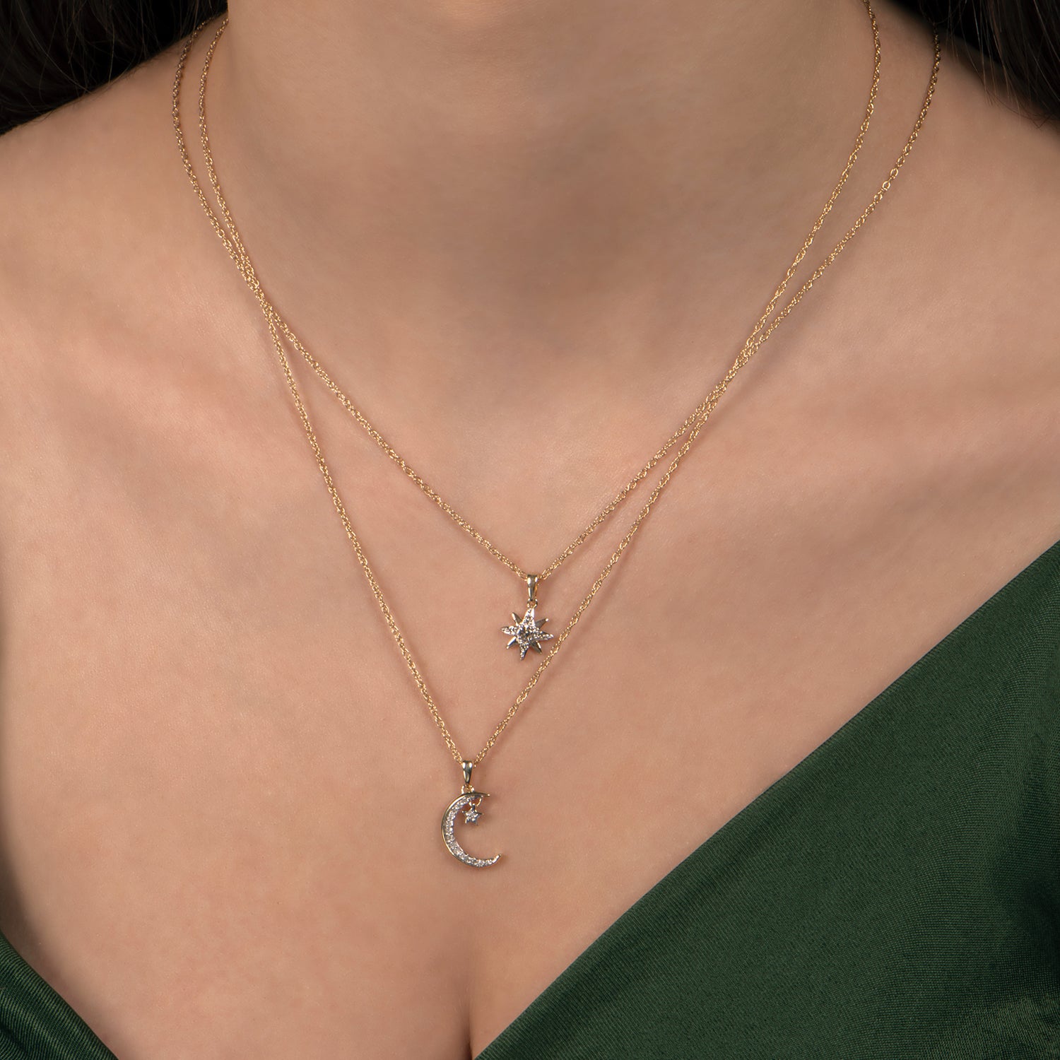 • Moon Star Pendant Necklace in 10K Yellow Gold with 1/10 Cttw Natural White Round Diamond, 18" Rope Chain