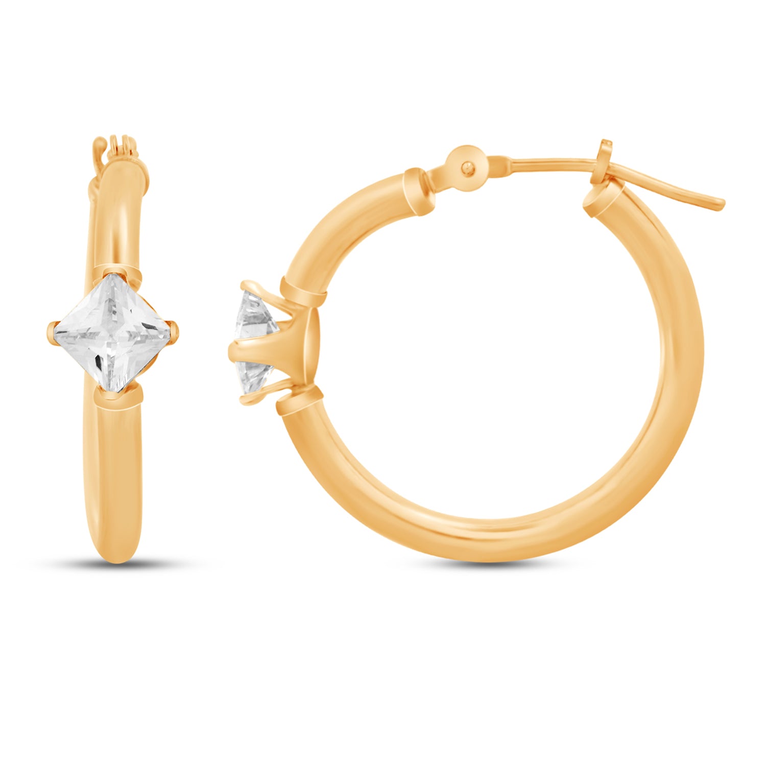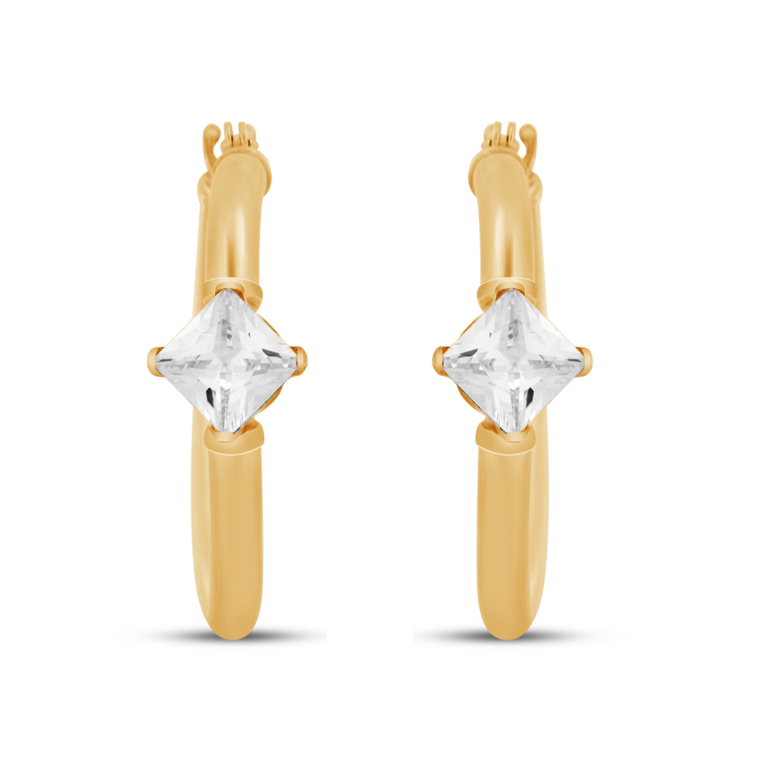 • Hoop Earrings in 10K Yellow Gold 4 MM Square Shape White Cubic Zirconia Round
