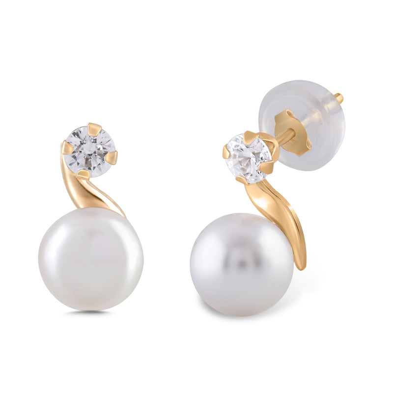 • Stud Earrings in 10K Yellow Gold 6 mm Pearl and Cubic Zirconia