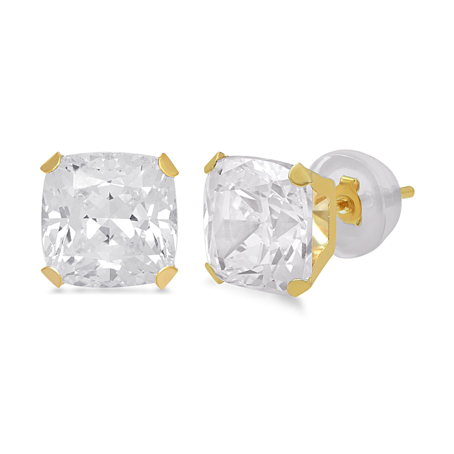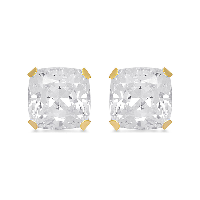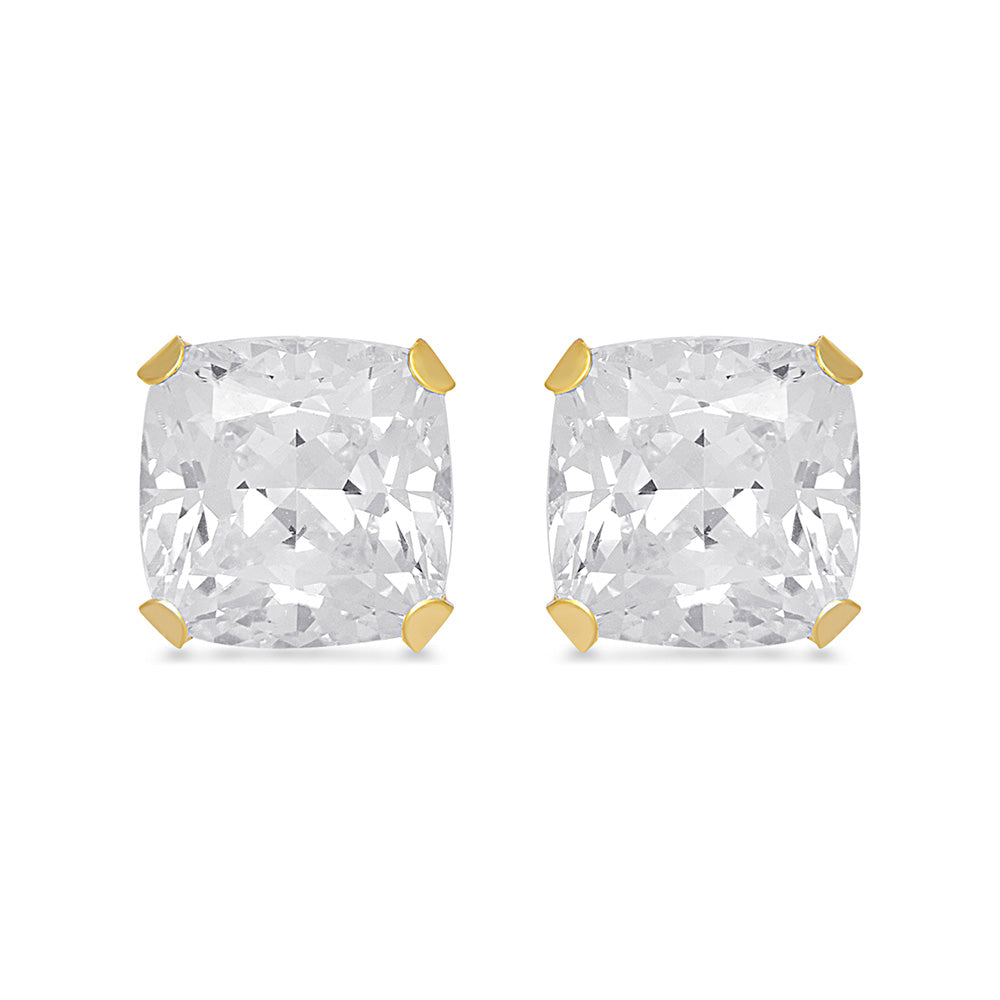 • Stud Earrings in 10K Yellow Gold with 7x7 MM Cushion Cut Cubic Zirconia