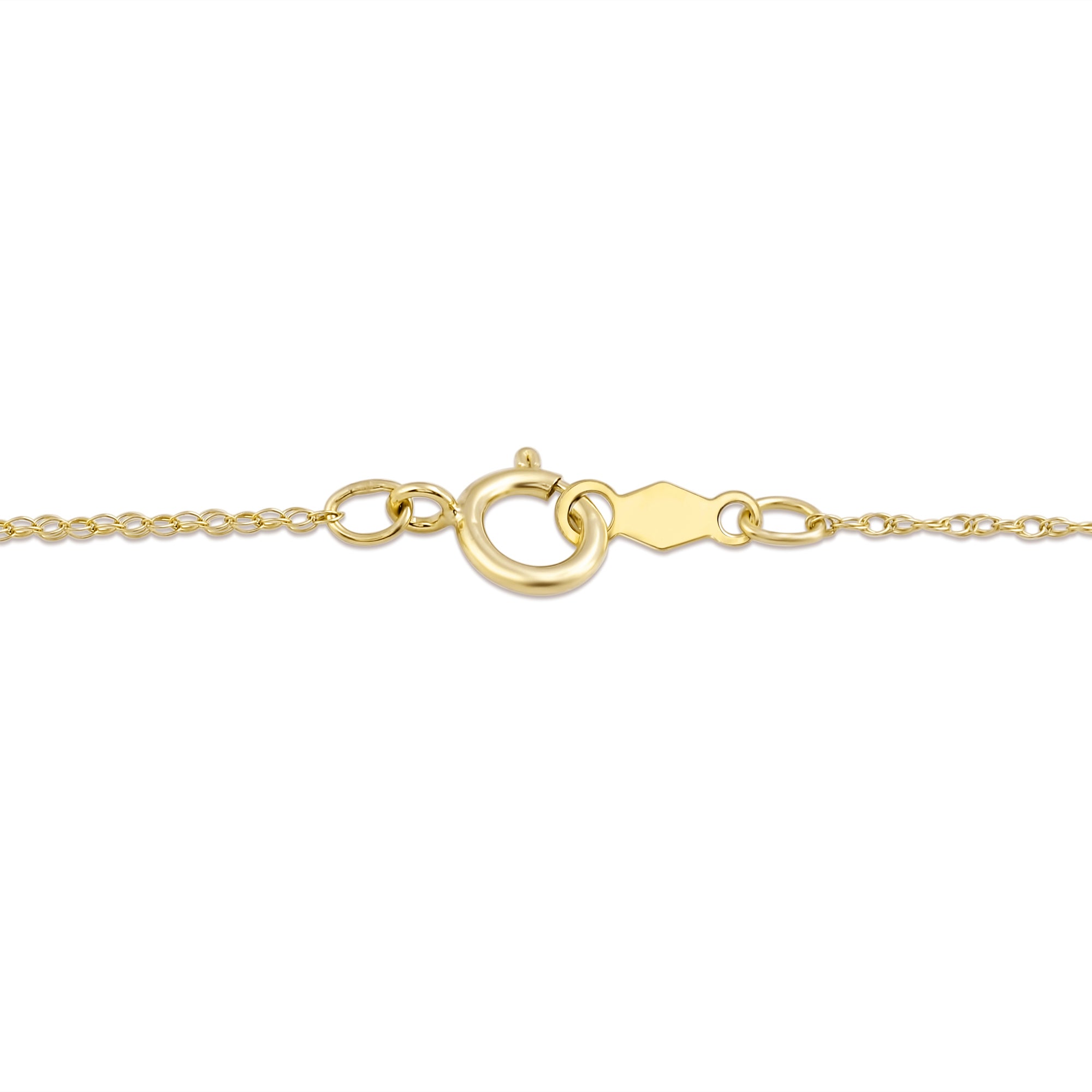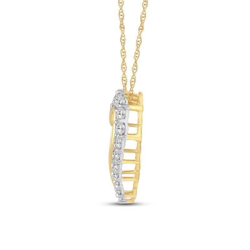 This is a 10 karat yellow gold pendant necklace with a heart-shaped pendant that features 1/10 carat total weight of natural white round diamonds. The pendant is attached to an 18-inch rope chain, making it a perfect length for everyday wear. The diamonds are arranged in a beautiful pattern that enhances the overall design of the pendant, adding a touch of elegance and sparkle. This necklace would make a lovely gift for someone special or a great addition to your own jewelry collection.