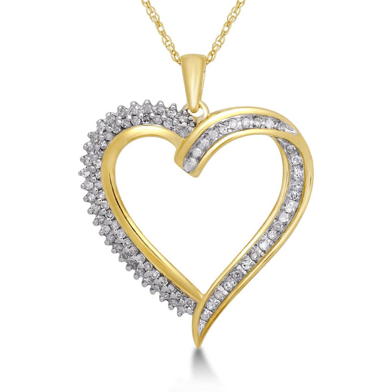 Jewelili 10K Yellow Gold With 1/4 CTTW Natural White Diamond Heart Shape Pendant Necklace