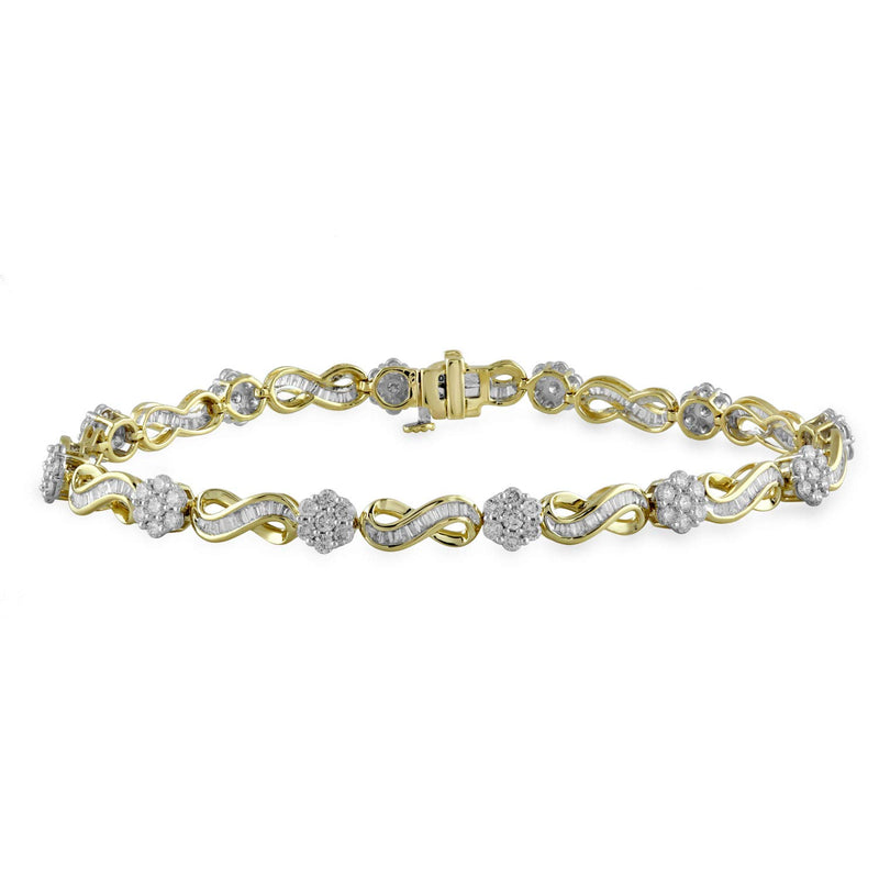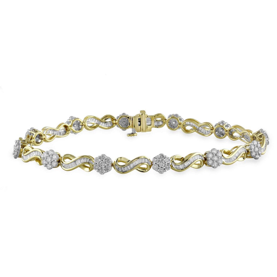 • Baguette Infinity and Round Diamond Cluster in 10K Yellow Gold Bracelet.