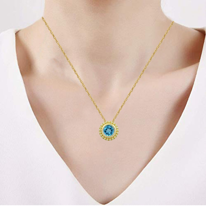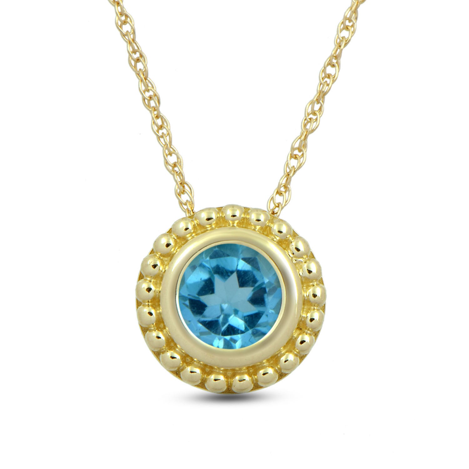 • Bezel Set 5mm Blue Topaz 10K Yellow Gold Pendant Necklace. Includes 18" Rope Chain