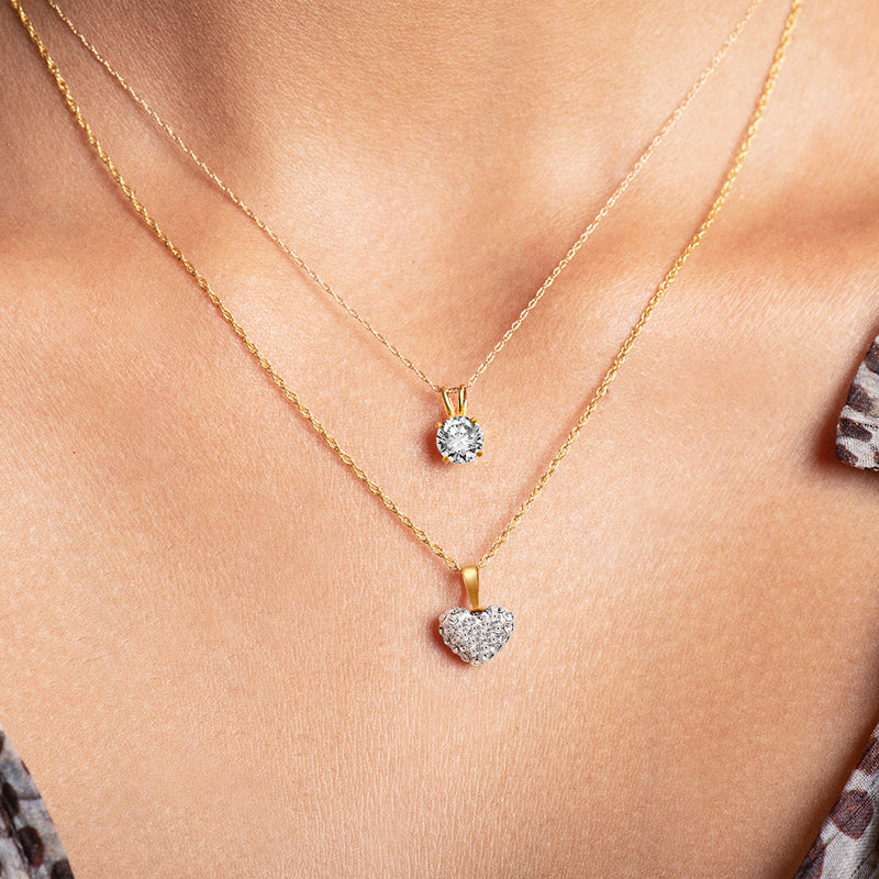 • Pendant necklace featuring 10k yellow gold puffed heart centerpiece filled with tinted Cubic Zirconia Elements