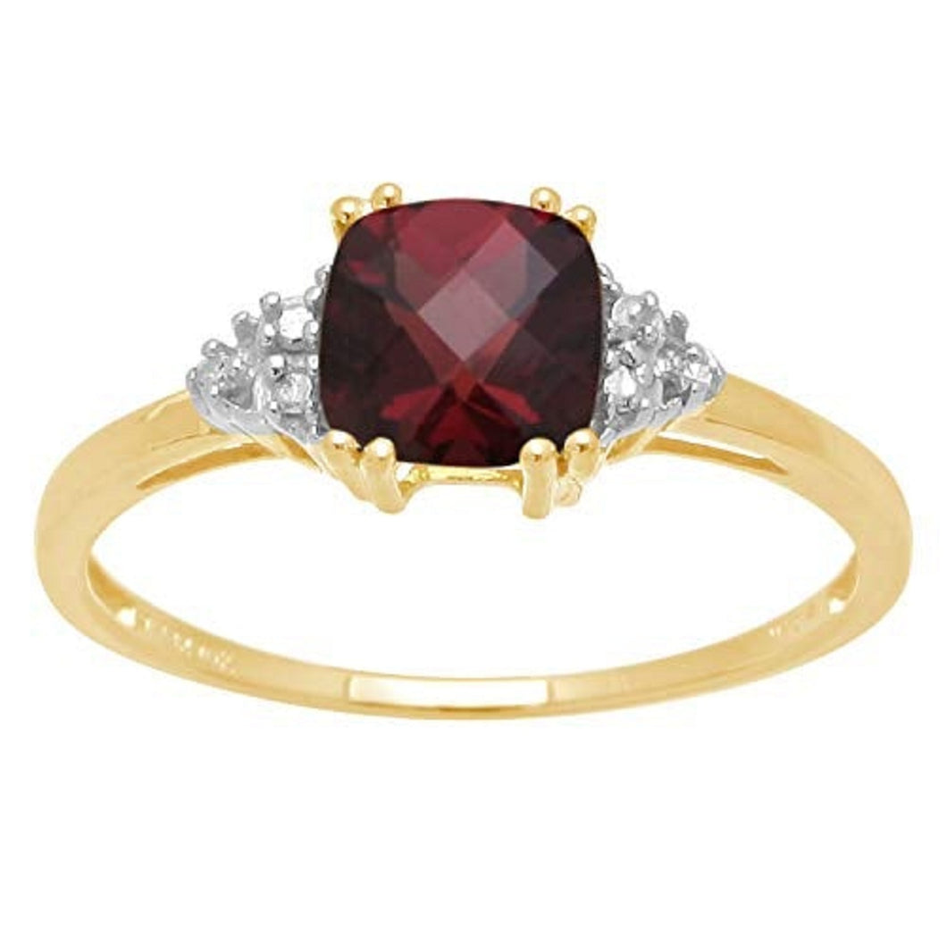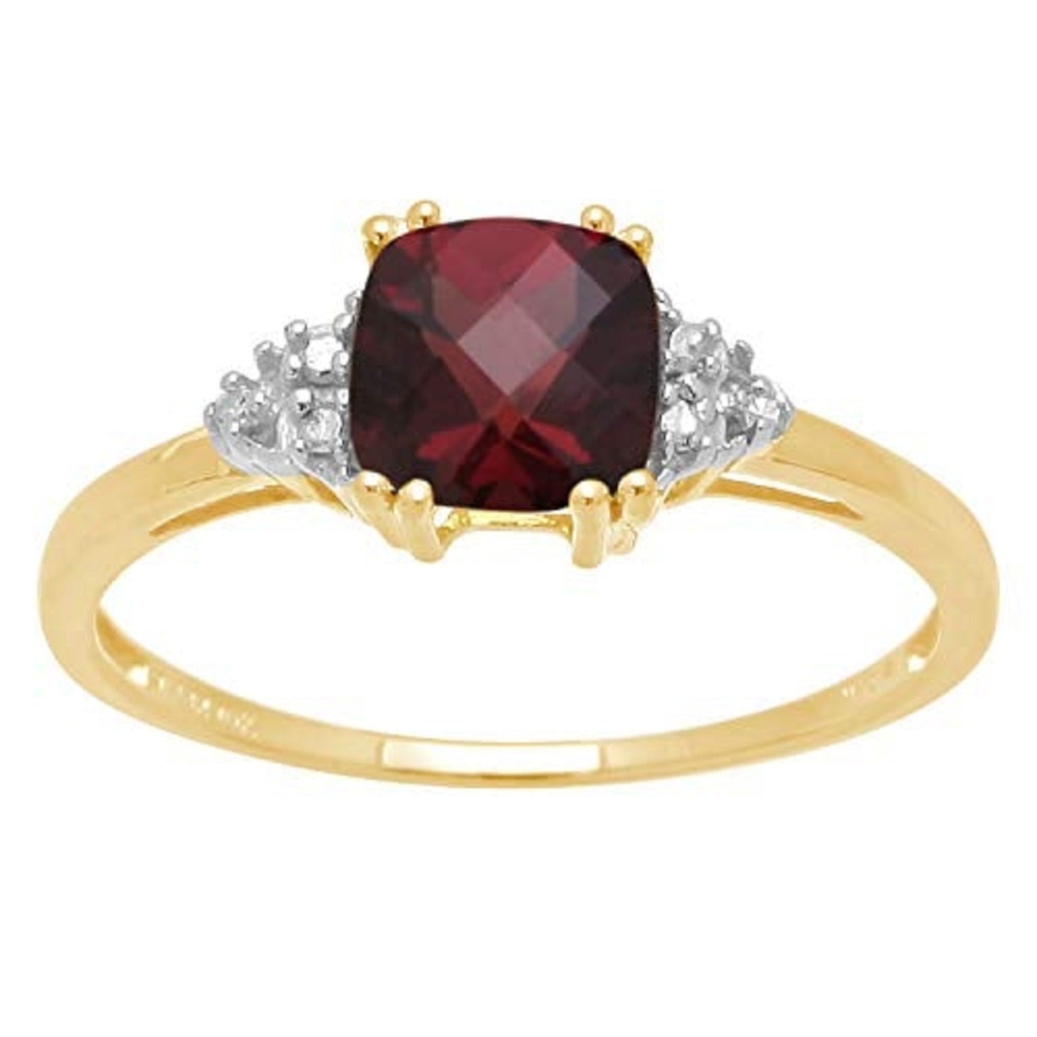 Jewelili 10K Yellow Gold With Red Garnet and Natural White Diamonds Halo Ring