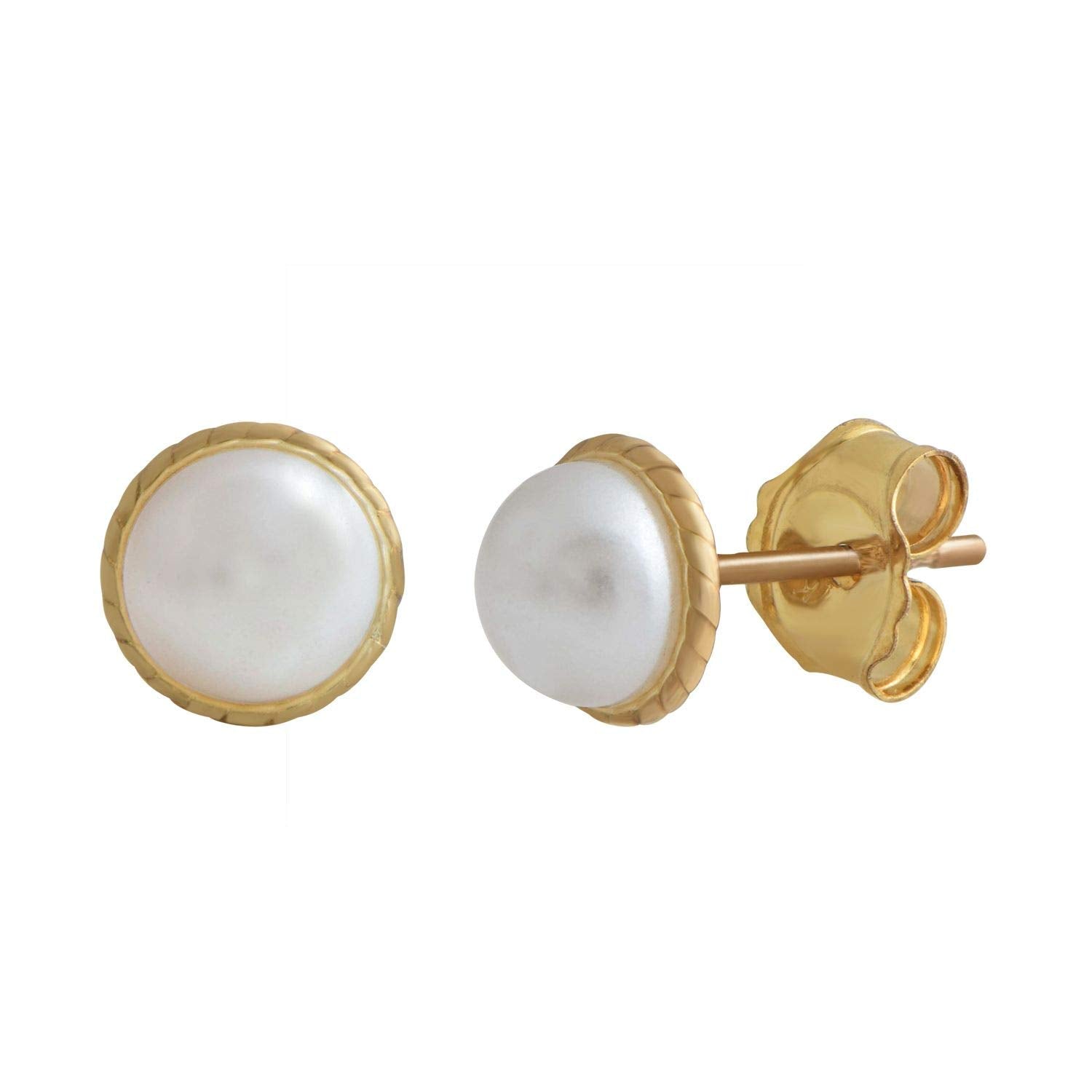 Jewelili 10K Yellow Gold With Round Glass Pearl Cubic Zirconia Stud Earrings