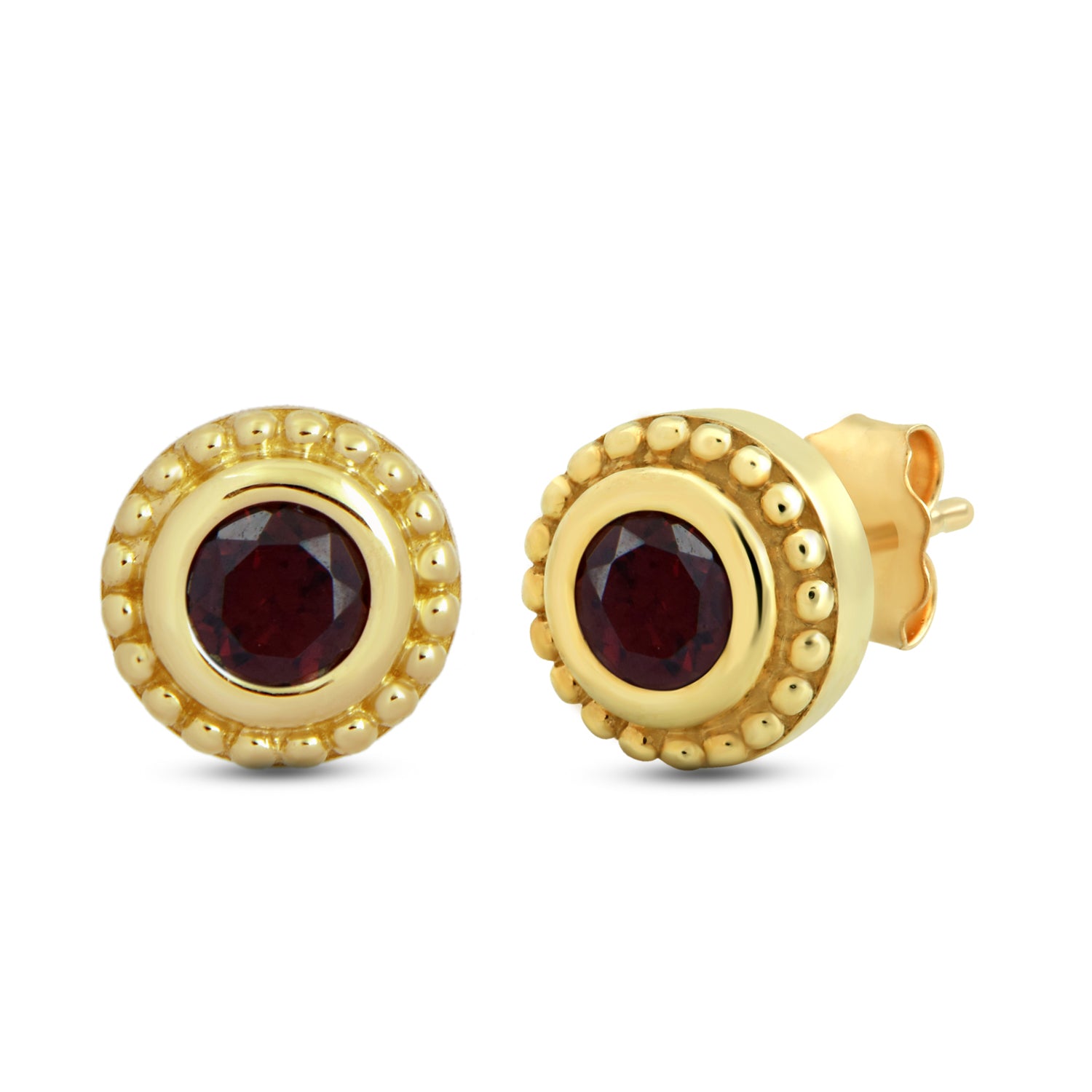 Jewelili 10K Yellow Gold with Natural Round Garnet Stud Earrings